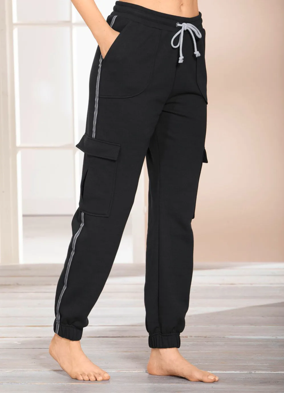 Lässige „Laurina”-Cargo-Hose in langer Form, mit Dehnbund rundum und Kordelzug, innen angerauht, zwei Seitennahttaschen, zwei große, seitliche Cargotaschen sowie elastische Bündchen an den Beinabschlüssen.
