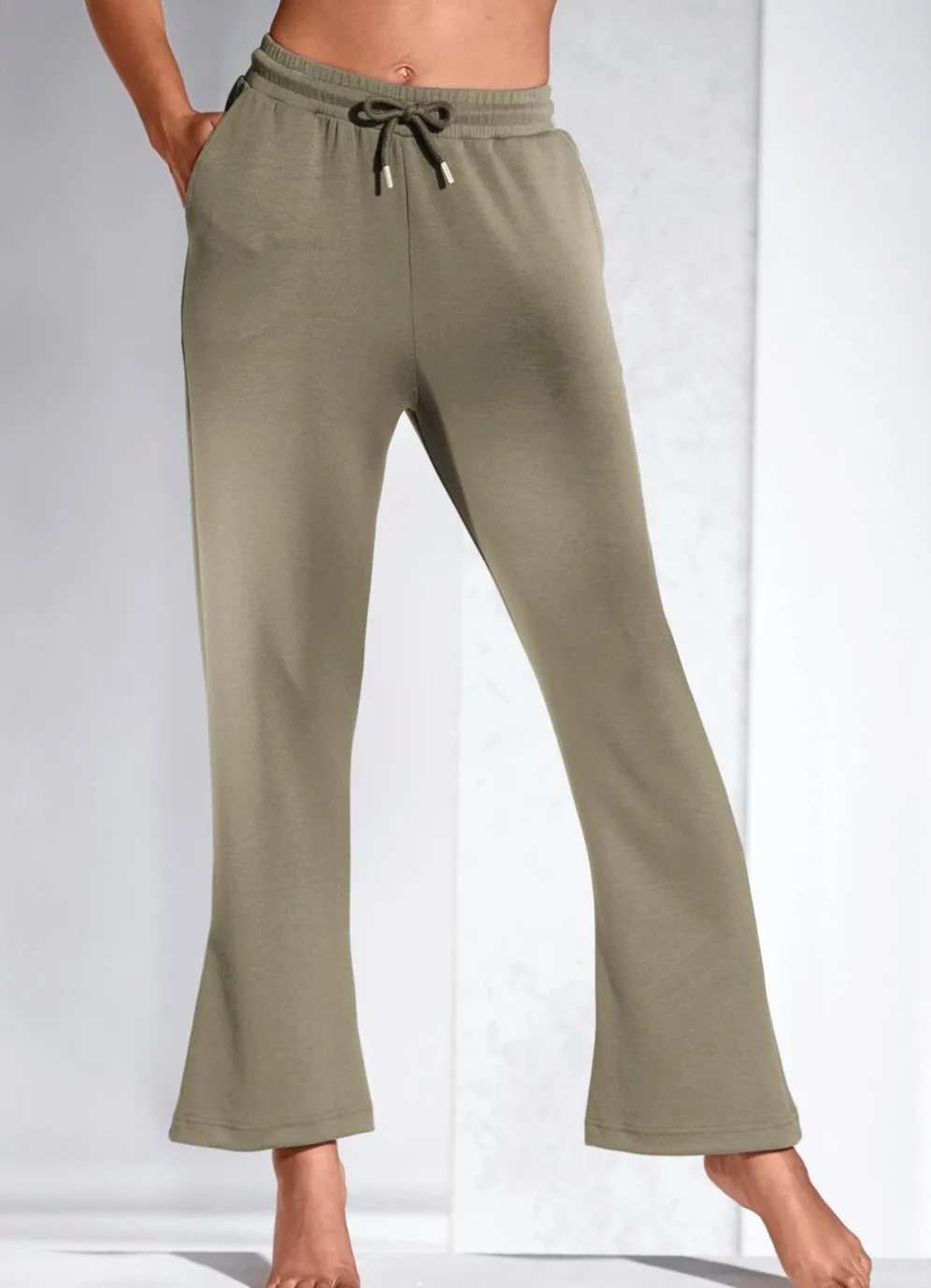 Gemütliche, weiche „Laurina”-Hose in langer Form, mit bequemen Dehnbund rundum, Bindeband, zwei Seitennahttaschen sowie leicht ausgestellter Fußweite.