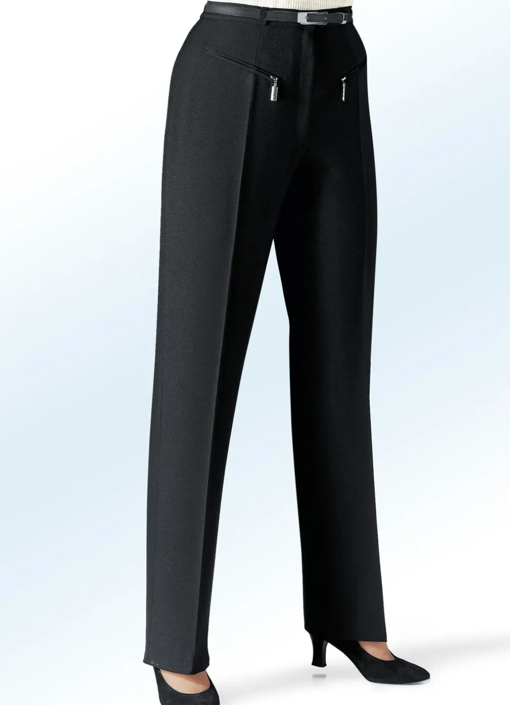 Ansprechende Hose mit Stretchbund, Gürtelschlaufen, Haken- und Reißverschluss, paspelierten Reißverschluss-Taschen mit Zieranhänger vorne. Innenbeinlänge ca. 76 cm, Fußweite ab 42 cm.