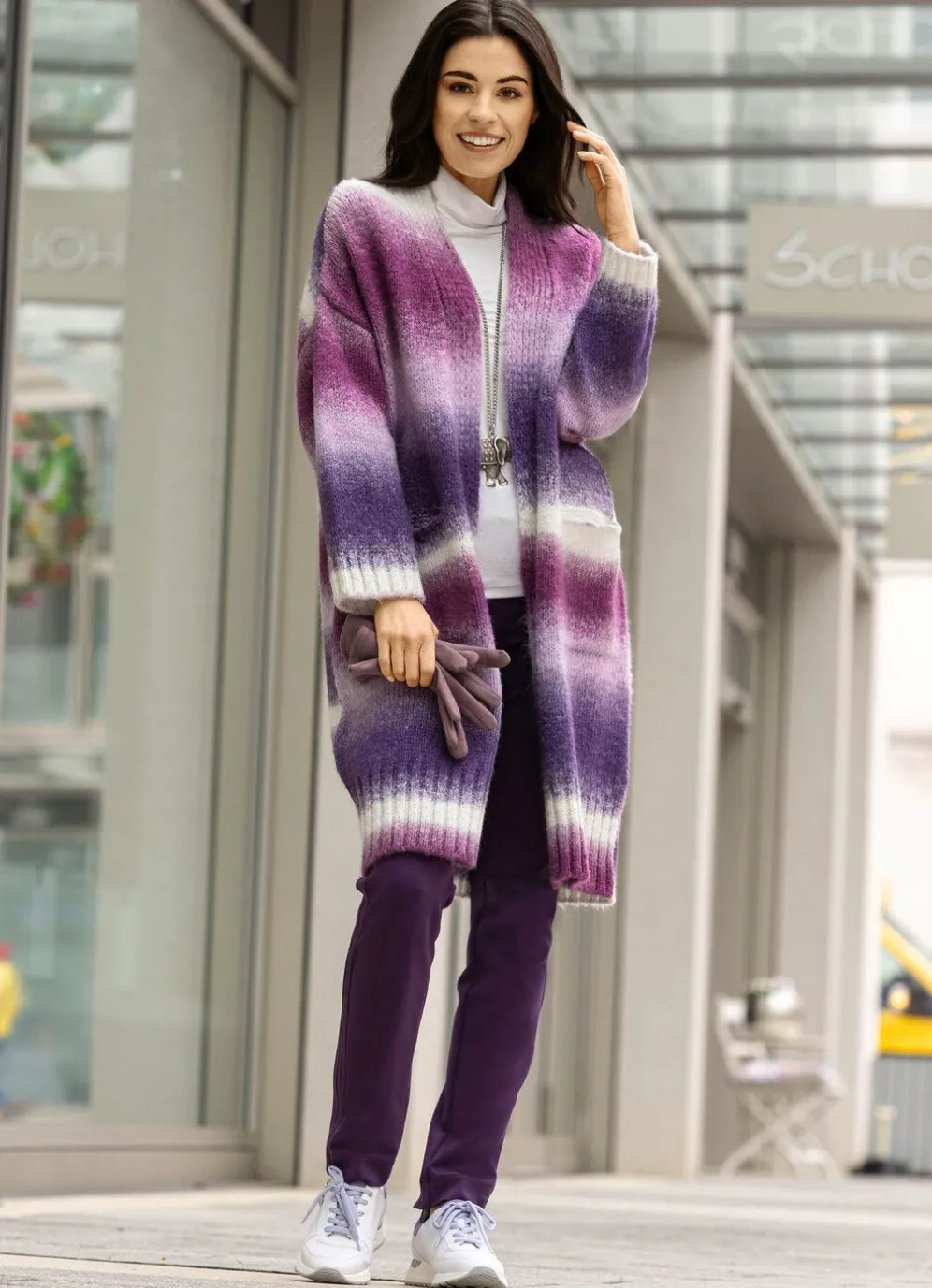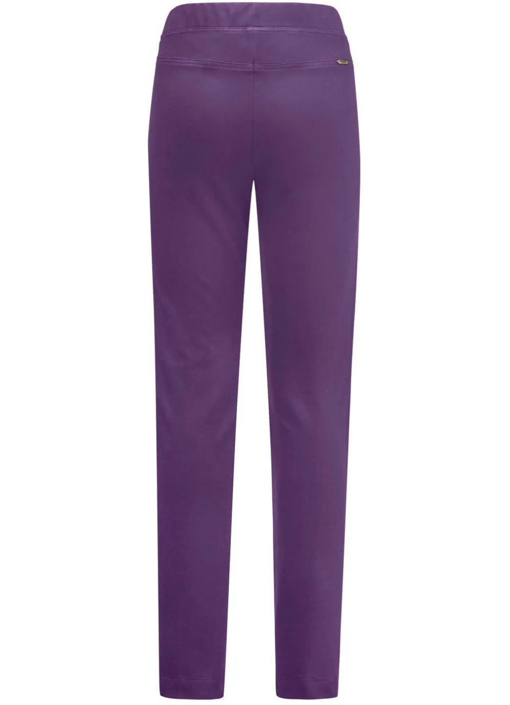 Trendgenaue, hochelastische Hose in Viola mit aktueller, schmaler Beinweite, die für eine schlanke Silhouette sorgt: komfortable Schlupfform, glatt anliegend dank des innenliegenden, unsichtbaren Rundum-Dehnbundes, vordere, paspelierte Taschen sowie Einsätze mit Teilungsnähten und dekorativen Ziersteppungen im Vorderteil sowie figurformende Passe im Rückteil. Innenbeinlänge ca. 76 cm, Fussweite ab 30 cm.
