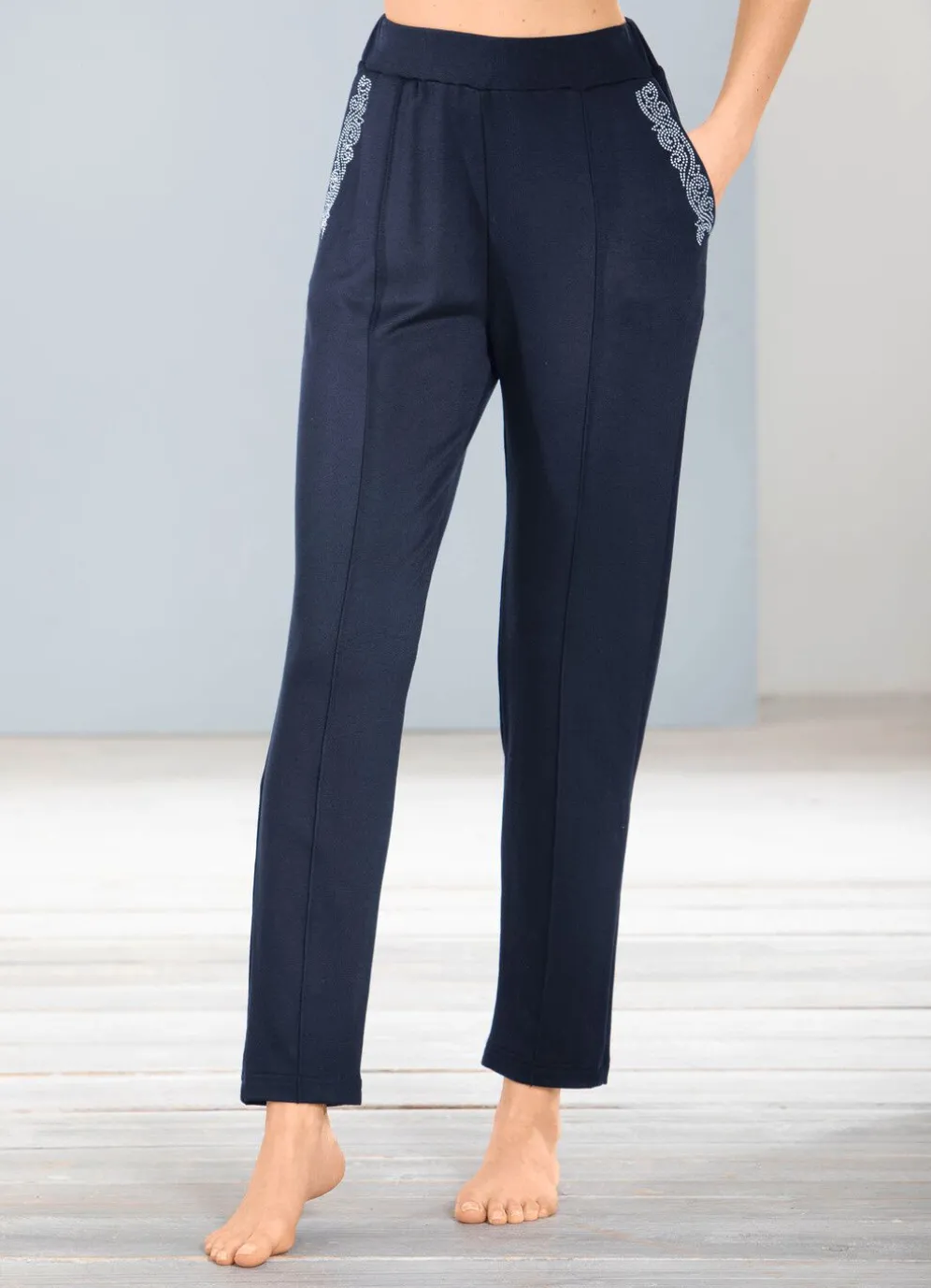 Komfortable „Plantier“-Hose in langer Form, mit breitem Dehnbund rundum, hübscher Schmucksteinzier an den zwei Schubtaschen.