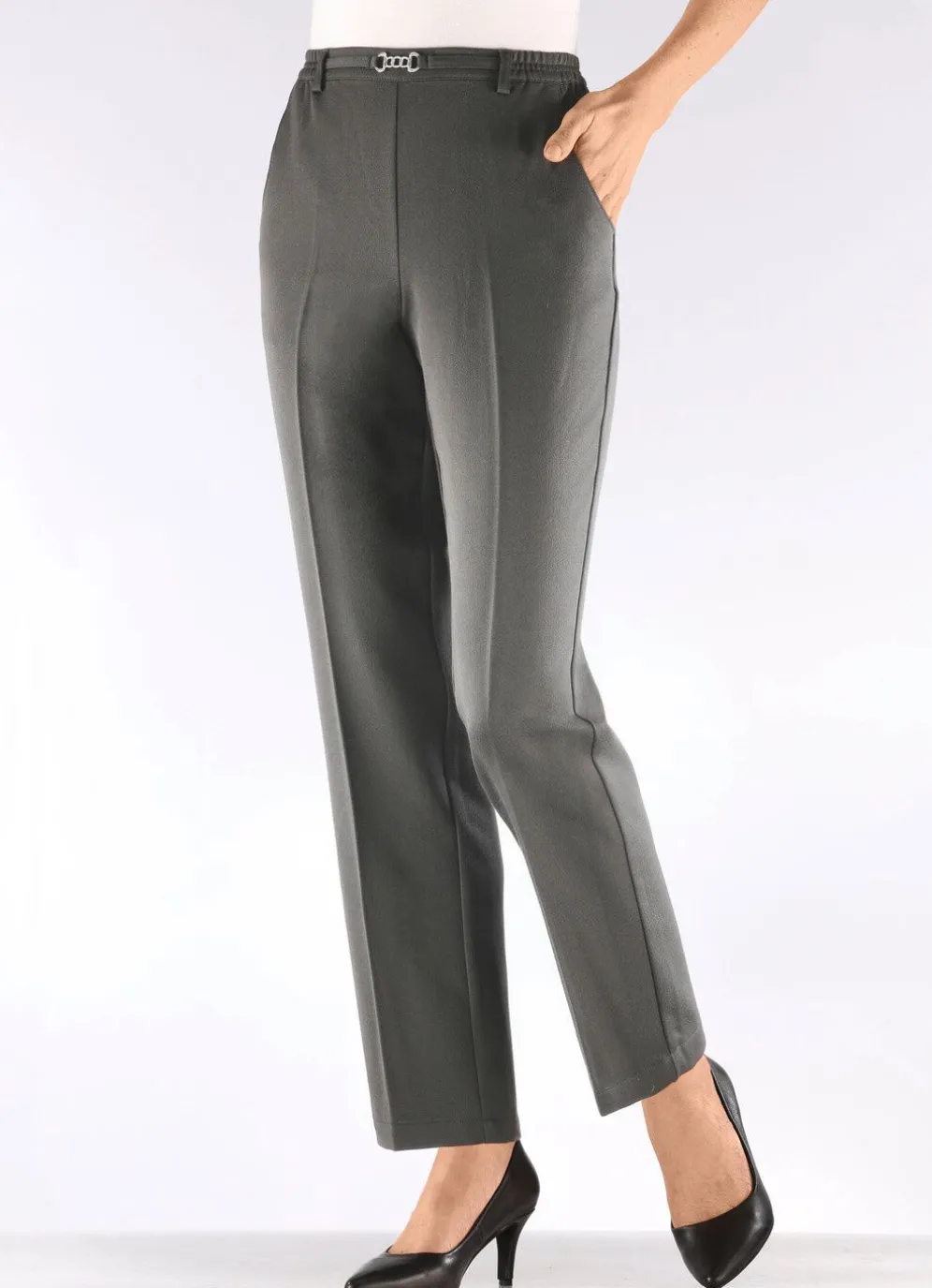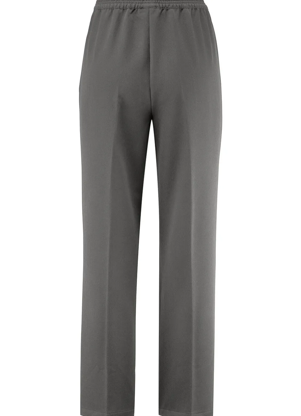 Schicke, knöchellange Hose: bequeme Schlupfform, Dehnbund rundum mit vorderem, glattem Teilstück, schmückendes Zierteil vorne am Bund sowie Seitentaschen. Innenbeinlänge ca. 71 cm, Fußweite ab 40 cm.