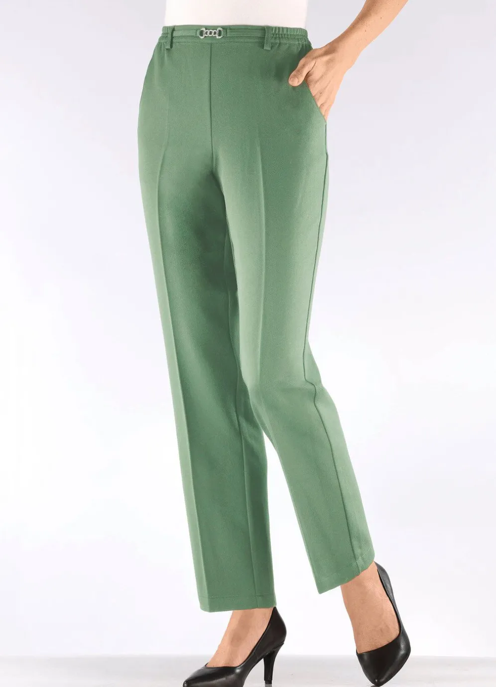 Schicke, knöchellange Hose: bequeme Schlupfform, Dehnbund rundum mit vorderem, glattem Teilstück, schmückendes Zierteil vorne am Bund sowie Seitentaschen. Innenbeinlänge ca. 71 cm, Fußweite ab 40 cm.