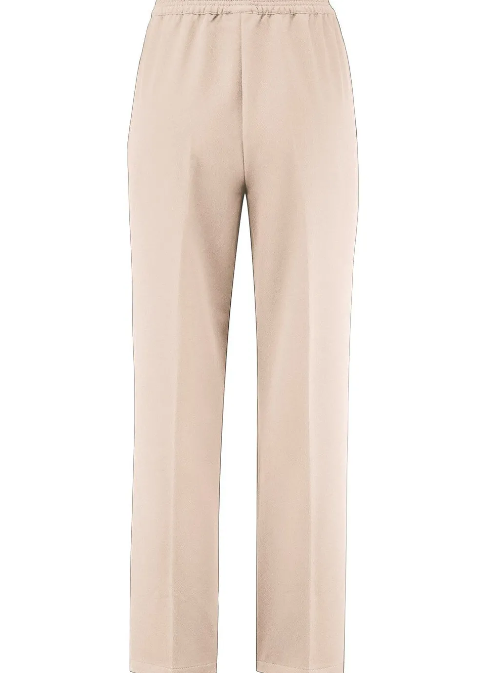 Schicke, knöchellange Hose: bequeme Schlupfform, Dehnbund rundum mit vorderem, glattem Teilstück, schmückendes Zierteil vorne am Bund sowie Seitentaschen. Innenbeinlänge ca. 71 cm, Fußweite ab 40 cm.