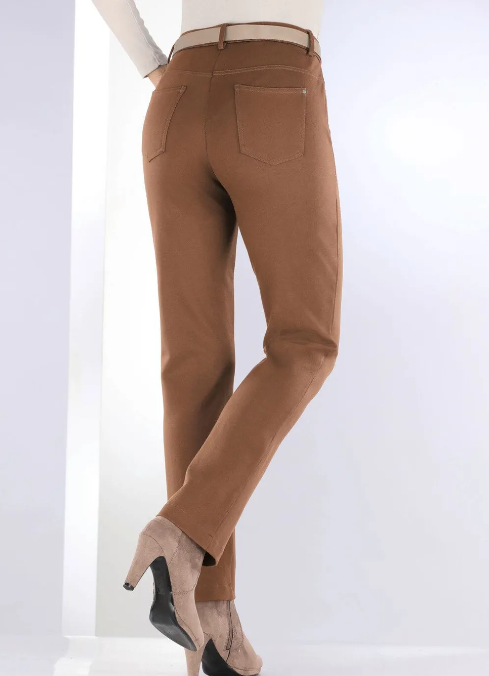 Mit sportivem Chic präsentiert sich diese hochelastische Hose: elastischer Bund, Gürtelschlaufen, Knopf- und Reißverschluss, Seitentaschen, aufgesetzte Gesäßtaschen sowie figurformende Passe im Rückteil. Innenbeinlänge ca. 77 cm, Fußweite ab 38 cm.