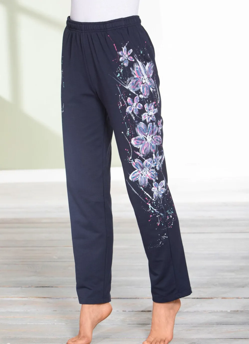 Jedes Teil ein Unikat! Diese lange Hose mit bequemem Dehnbund rundum, Kordelzug und zwei Schubtaschen überzeugt mit einem Spraydruck im Vorderteil.