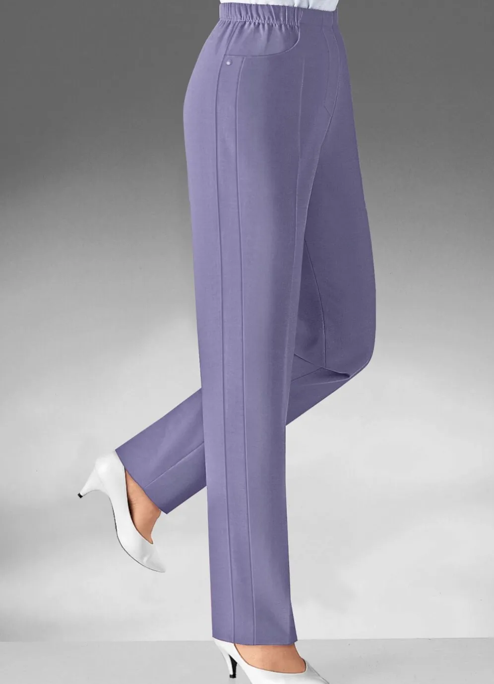 Ansprechende, der Figur schmeichelnde Hose: bequeme Schlupfform, Dehnbund rundum mit vorderem, glattem Teilstück, Reißverschluss-Zierblende, schmückende Zierplättchen unterhalb der Seitentaschen sowie figurgünstige Teilungsnähte im Vorderteil, die eine schlanke Beinsilhouette zaubern. Innenbeinlänge ca. 77 cm, Fußweite ab 39 cm.