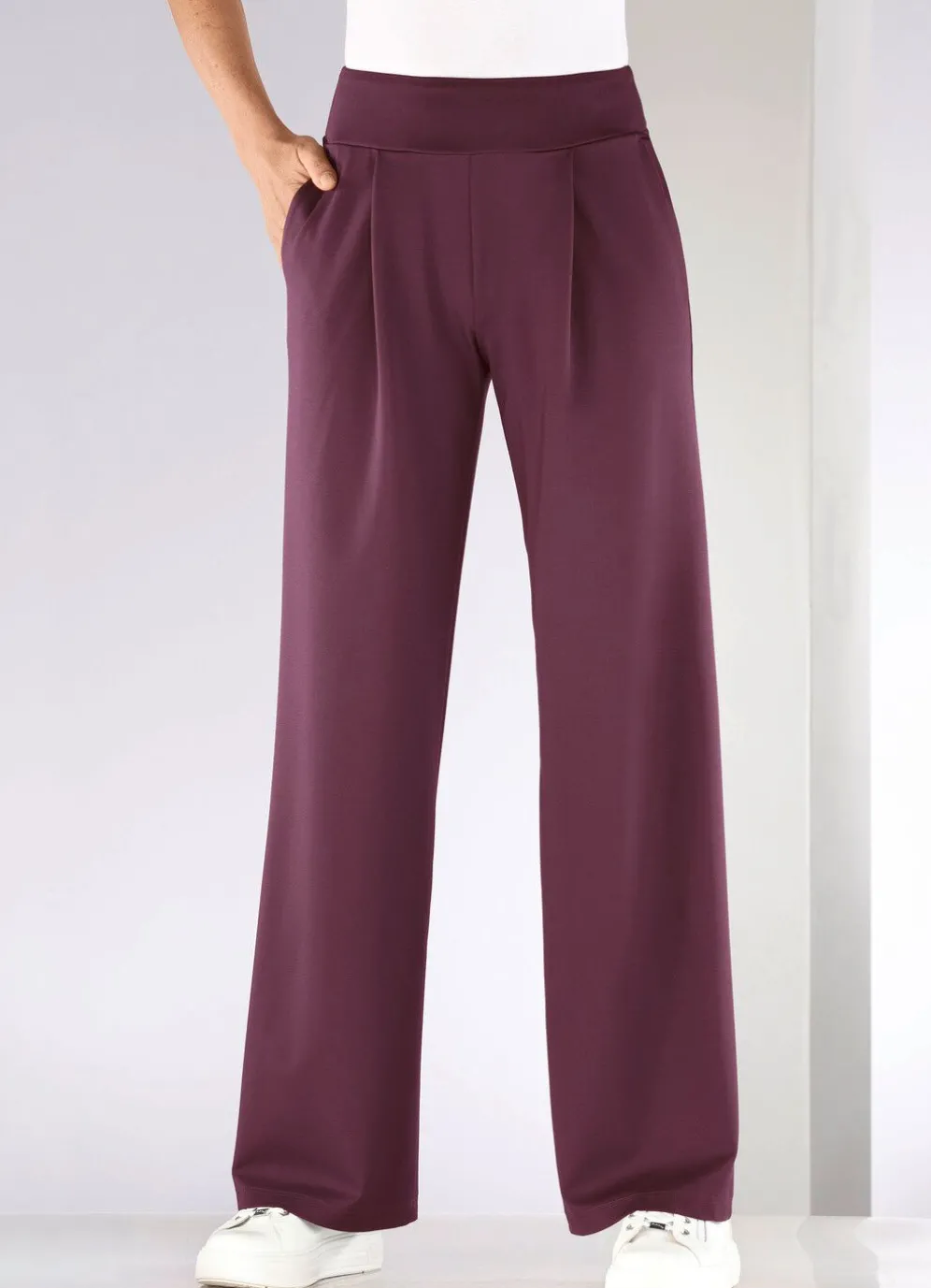 Ihr Modell VITA – fabelhafte Hose mit modisch weitem, leicht ausgestelltem Beinverlauf in Schlupfform, glatt anliegend dank des innenliegenden Rundum-Dehnbundes, Seitentaschen sowie Bundfalten im Vorderteil. Innenbeinlänge ca. 79 cm, Fußweite ab 54 cm.