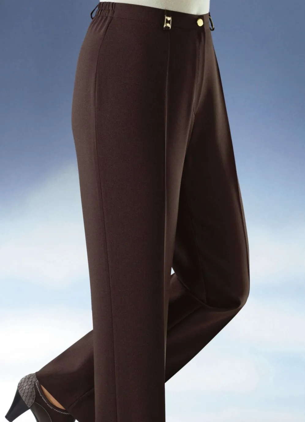 Schick und bequem: Hose mit weiterem Bundumfang, schmalem Beinverlauf, rückwärtigen Dehnbundeinsätzen, je einem schmückenden Zierteil an den beiden vorderen Gürtelschlaufen, Haken- und Reißverschluss sowie seitlichen Schlitzen an den Beinabschlüssen. Innenbeinlänge ca. 78 cm, Fußweite ab 40 cm.