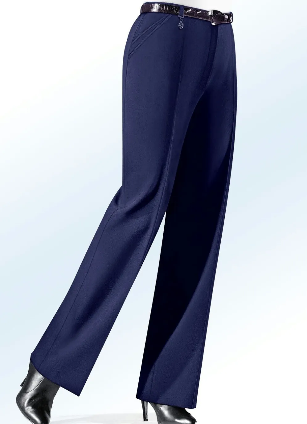 In bester Qualität und Verarbeitung zeigt sich diese attraktive Hose mit modisch ausgestellter Fußweite: rückwärtige Dehnbundeinsätze, aparter Zieranhänger an einer der vorderen Gürtelschlaufen, Haken- und Reißverschluss sowie Seitentaschen mit interessantem Blenden-Effekt. Innenbeinlänge ca. 79 cm, Fußweite ab 54 cm.