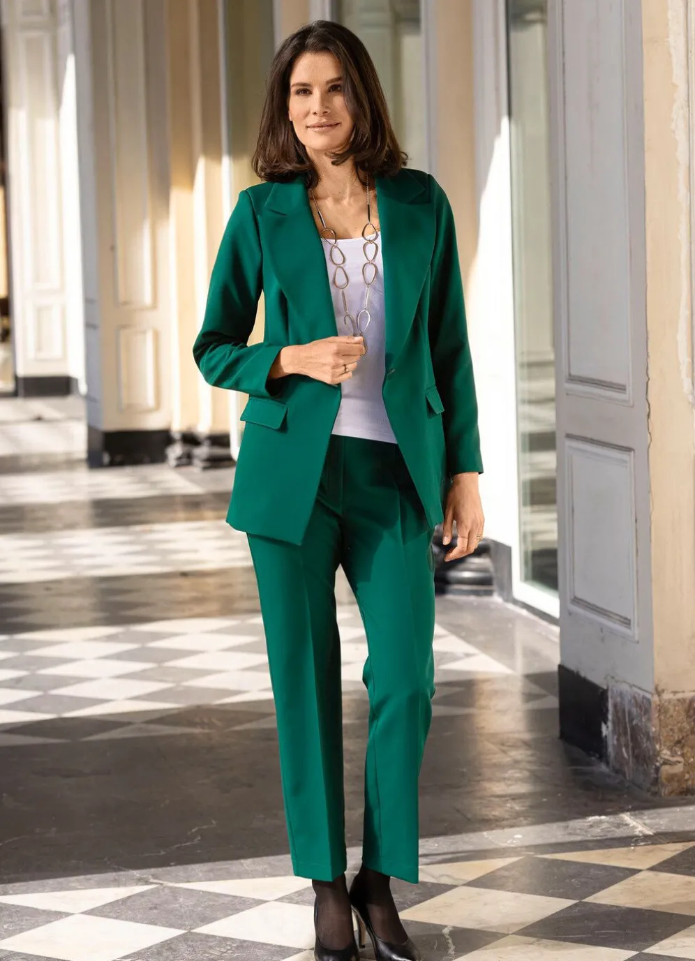 Für einen starken Auftritt sorgt dieser flaschengrüne Hosenanzug: Ein zeitlos eleganter Blazer mit Reverskragen, Knopfverschluss und Pattentaschen. Länge ca. 70 cm, ab Gr. 44 ca. 72 cm, ab Gr. 48 ca. 74 cm. Die Hose in femininer, verkürzter Länge mit Bund, Gürtelschlaufen, Knopf, Reißverschluss und Schubtaschen. Innenbeinlänge ca. 73 cm, Fußweite ca. 42 cm.