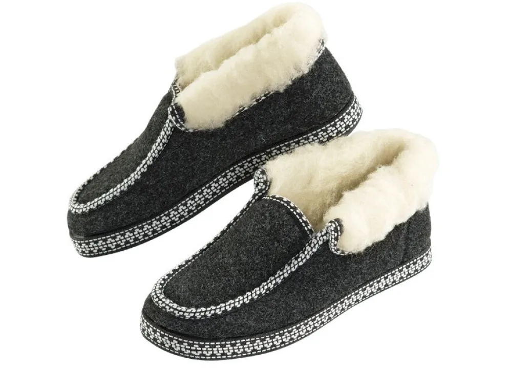 Bezaubernder Hütten-Hausschuh mit abgesetzter Kontrastborte, Obermaterial aus weichem Textilmaterial, Futter und Decksohle aus reiner Schurwolle und mit einer flexiblen Antirutsch-Gummi-Laufsohle. Gr: 36–42.
