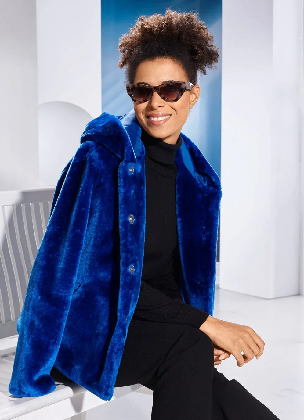Supertrendige Jacke in Royalblau, mit fester Kapuze, verdeckter Druckerleiste sowie Schubtaschen. Länge ca. 62 cm, ab Gr. 40 ca. 65 cm, ab Gr. 46 ca. 68 cm.