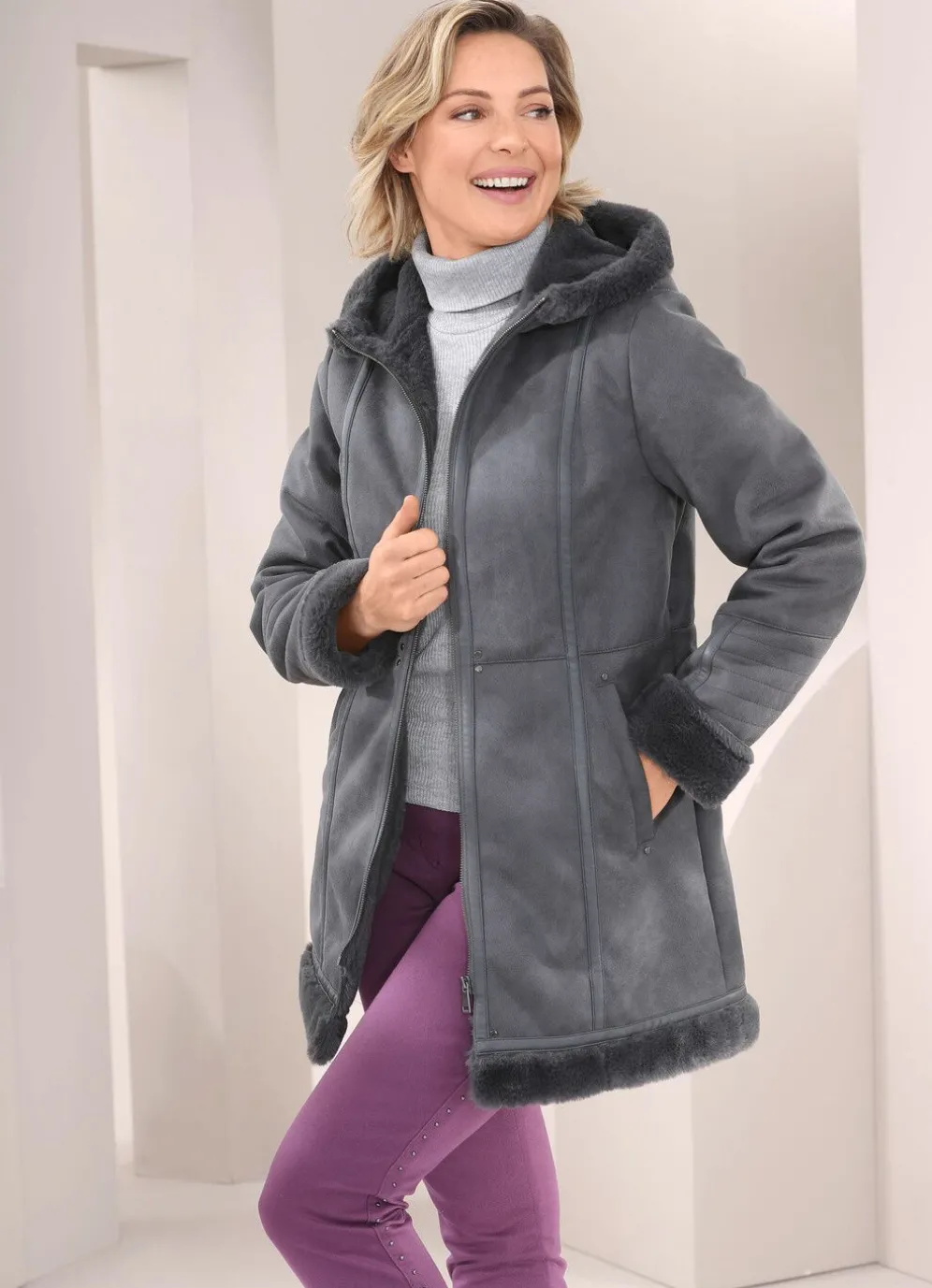 Jacke in Grafit, mit fester Kapuze, durch Reißverschluss hoch schließbarem Stehkragen, Blende und Ziernieten an den Schubtaschen sowie umschlagbaren Ärmeln. Länge ca. 80 cm, ab Gr. 46 ca. 82 cm.