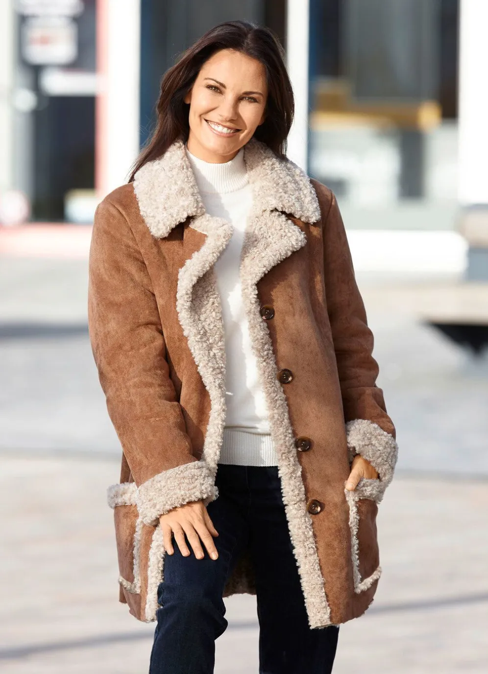 Bringt Sie auch an kalten Tagen zum Strahlen! Kuschelige, zimtfarbene Jacke mit Reverskragen, Knopfleiste und aufgesetzten Taschen. Länge ca. 82 cm.