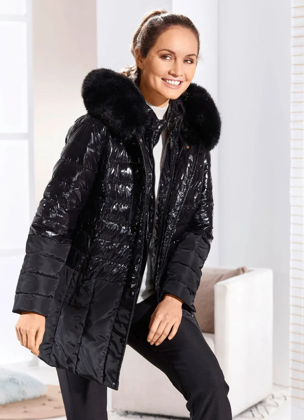 Ein modisches Highlight ist diese fabelhafte, schwarze Jacke mit abnehmbarem Kunstpelz-Besatz an der festen Kapuze, durch Reißverschluss hoch schließbarem Stehkragen am Westeneinsatz, Druckerleiste, Reißverschlusstaschen, Windfangärmeln aus Rippenstrick sowie einer Innentasche. Länge ca. 75 cm, ab Gr. 44 ca. 78 cm.