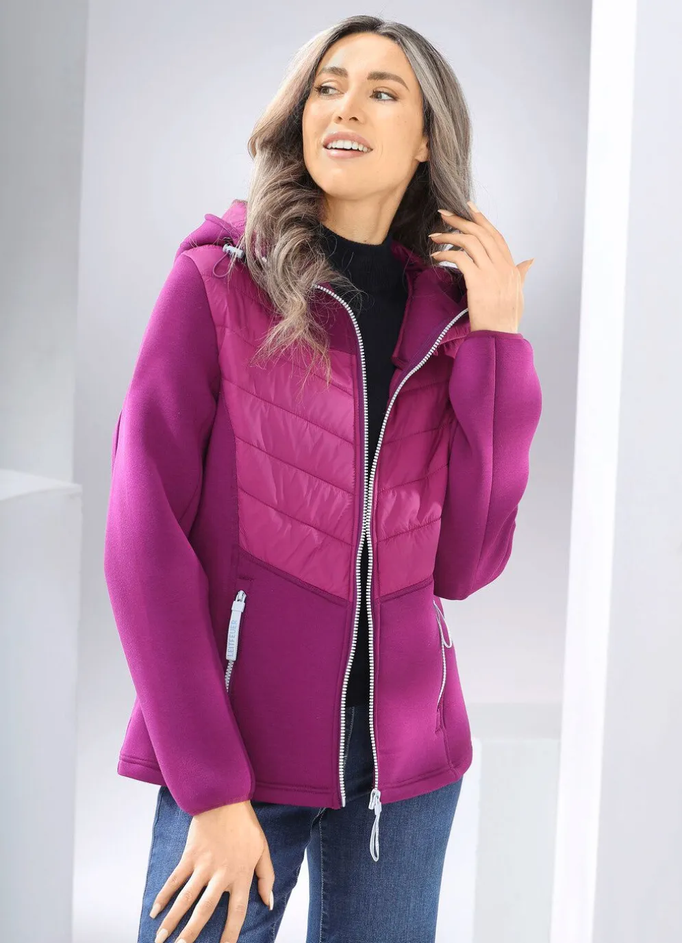Trendige, zyklamfarbene Jacke im aktuellen Materialmix mit Durchzugsband und Stopper an der festen Kapuze, Reißverschlussleiste sowie Taschen mit Reißverschluss. Länge ca. 60 cm, jede weitere Größe 1,5 cm länger.