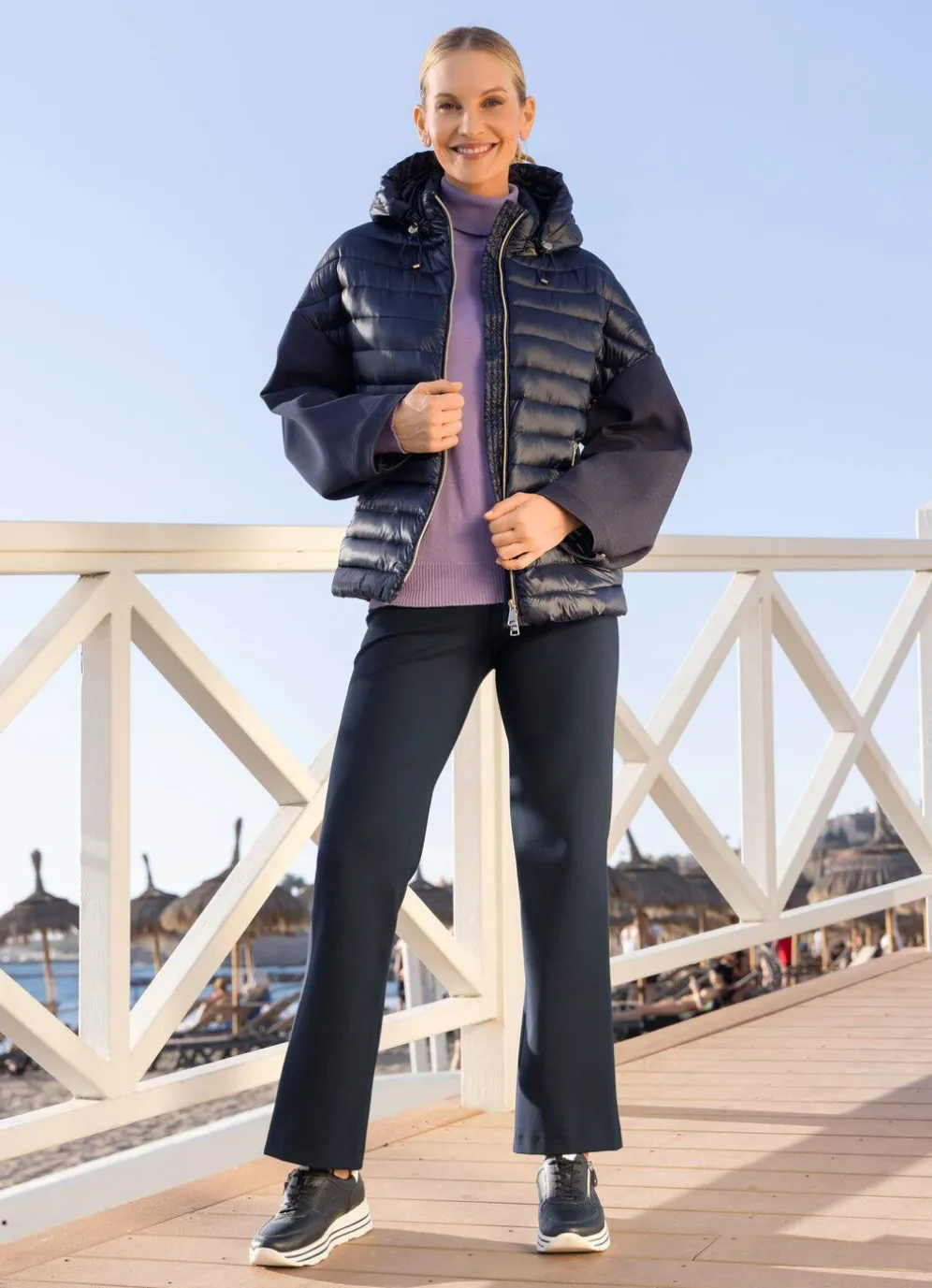 Jacke mit Durchzugsband und Stopper in der abnehmbaren Kapuze, durch 2-Wege-Reißverschluss hoch schließbarem Stehkragen, Taschen mit Reißverschluss, Drucker an den weitenregulierbaren Ärmelabschlüssen sowie leicht verlängertes, abgerundetes Rückteil. Länge ca. 70 cm, ab Gr. 42 ca. 72 cm, ab Gr. 46 ca. 74 cm, ab Gr. 50 ca. 76 cm