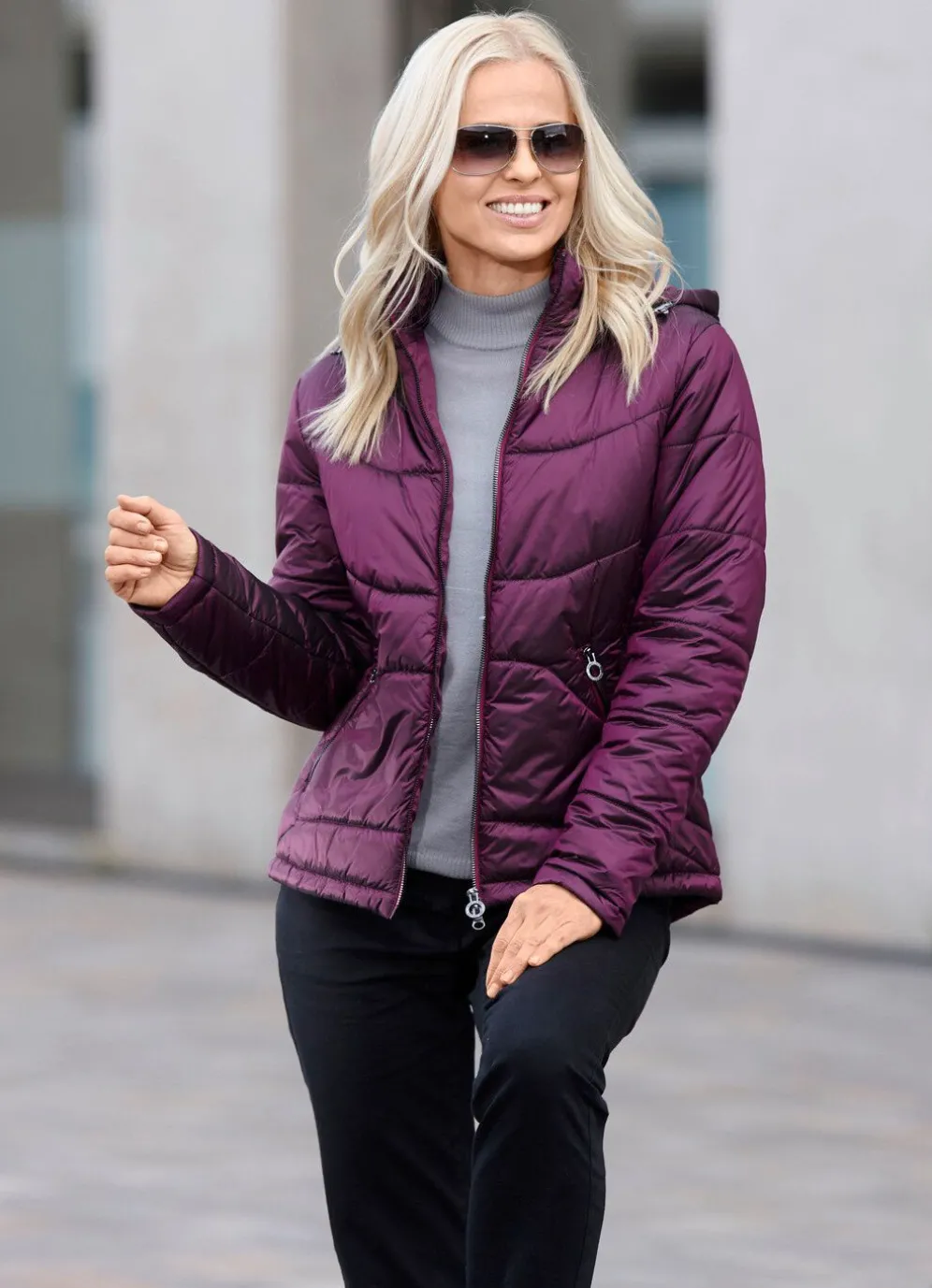 Ein echter Blickfang ist diese ausdrucksstarke Jacke mit Durchzugsband und Stopper in der abnehmbaren Kapuze, 2-Wege-Reißverschluss, hoch schließbarem Stehkragen, Reißverschlusstaschen, einer Innentasche sowie leicht verlängertem, abgerundetem Rückteil. Länge ca. 67 cm, ab Gr. 40 ca. 69 cm, ab Gr. 44 ca. 71 cm, ab Gr. 48 ca. 73 cm, bei Gr. 52 ca. 75 cm.