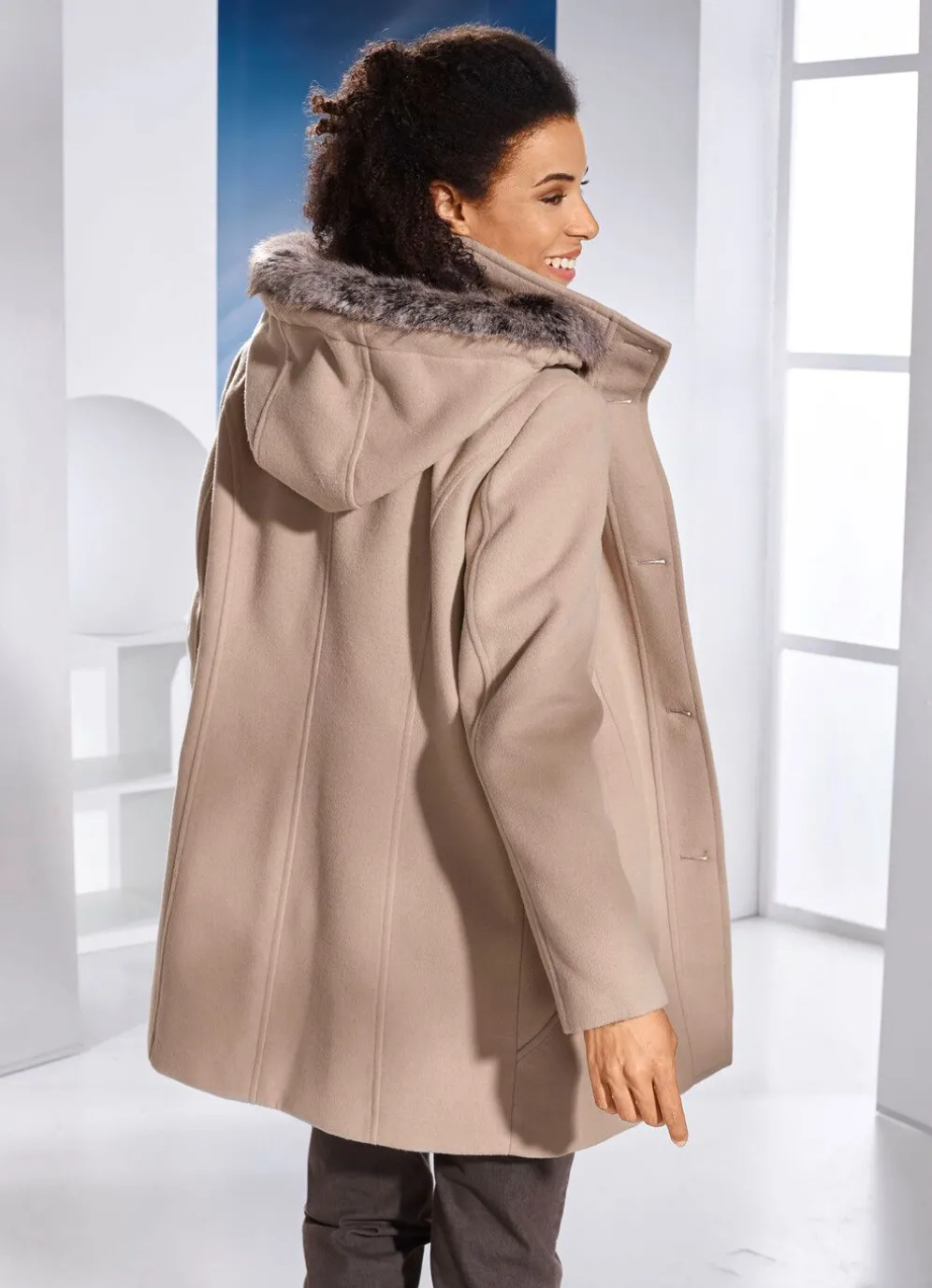 Tolle Jacke mit Durchzugsband, Stopper und abnehmbarem Kunstpelz-Besatz an der abnehmbaren Kapuze, durch Reißverschluss unter der Knopfleiste hoch schließbarem Stehkragen, Reißverschluss an den Paspeltaschen sowie einer Innentasche. Länge ca. 84 cm, bei K-Gr. ca. 80 cm.