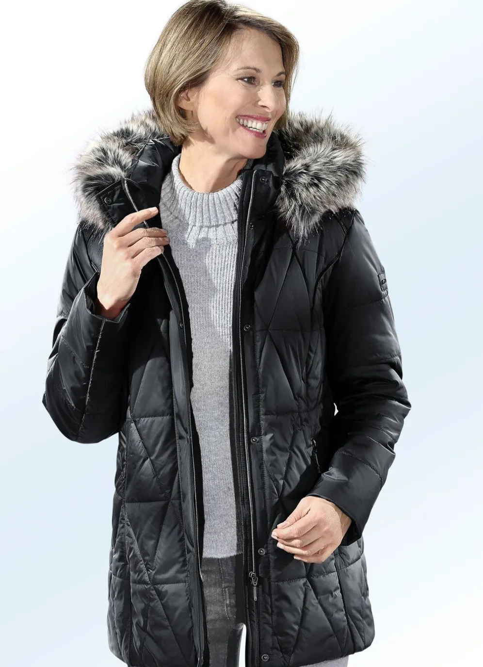 Diese fabelhafte Jacke darf in Ihrem Kleiderschrank nicht fehlen! Das Modell zeigt sich mit abnehmbarem Kunstpelz-Besatz an der abnehmbaren Kapuze mit Durchzugsband und Stopper, durch Reißverschluss unter der Druckerleiste hoch schließbarem Stehkragen, Reißverschluss-Paspeltaschen, umschlagbaren Ärmeln sowie einer Innentasche. Länge ca. 76 cm, ab Gr. 46 ca. 78 cm, ab Gr. 52 ca. 80 cm.