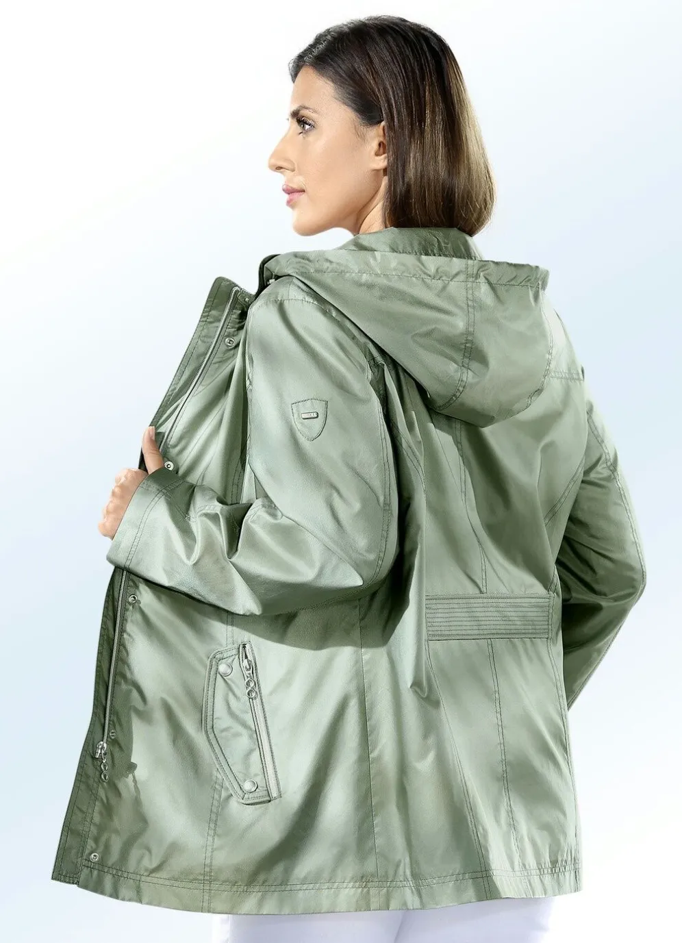 Topaktuelle Jacke mit Durchzugsband und Stopper in der abnehmbaren Kapuze, durch Reißverschluss unter der Druckerleiste hoch schließbarem Steh-Umlegekragen, Reißverschlusstaschen mit Zierpatte und Zierdruckern, umschlagbaren Ärmeln, einer Innentasche sowie im Rückteil eingearbeitetem Taillenriegel. Länge ca. 72 cm, ab Gr. 46 ca. 75 cm, ab Gr. 52 ca. 78 cm, ab Gr. 58 ca. 81 cm.