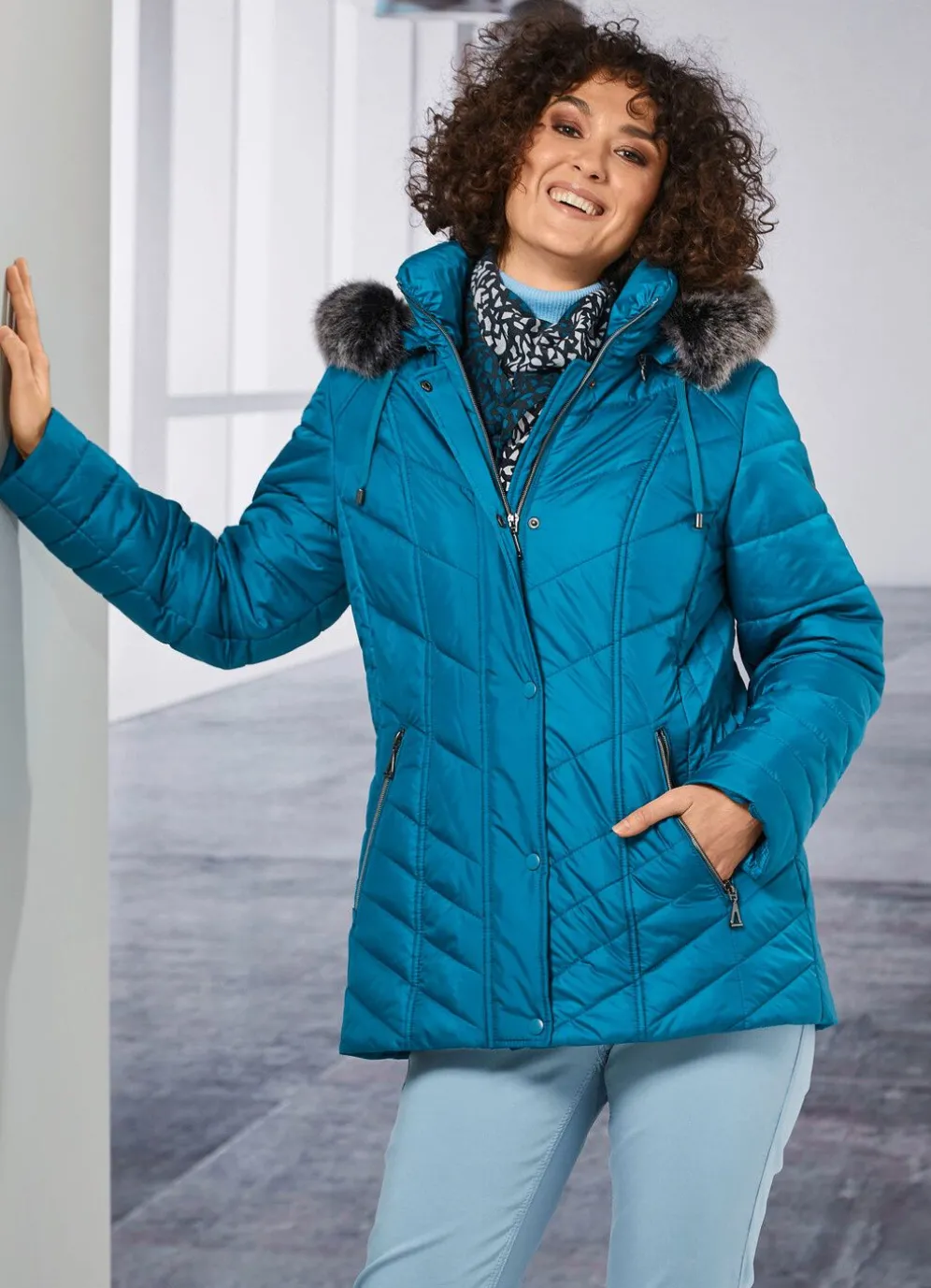 Attraktive Jacke mit Durchzugsband, Stopper und abnehmbarem Kunstpelz-Besatz an der abnehmbaren Kapuze, durch Reißverschluss unter der Druckerleiste hoch schließbarem, gefälteltem Stehkragen, Reißverschlusstaschen, umschlagbaren Ärmeln sowie einer Innentasche. Länge ca. 72 cm, ab Gr. 42 ca. 74 cm, ab Gr. 46 ca. 76 cm.