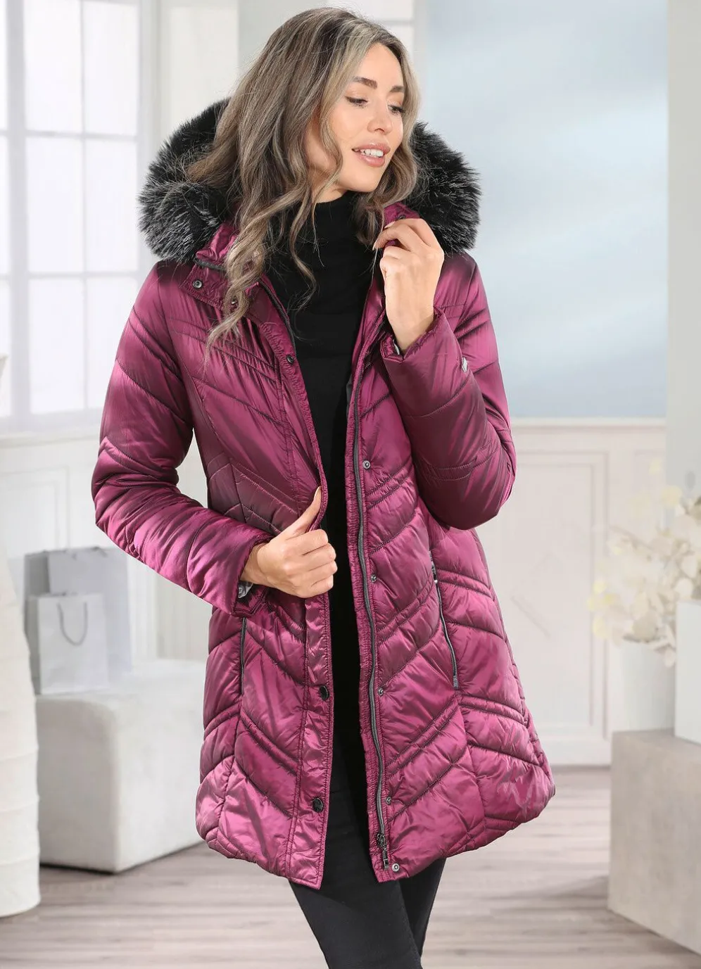 Jacke in Zyklam mit Durchzugsband, Stopper und abnehmbarem Kunstpelz-Besatz an der abnehmbaren Kapuze, durch Reißverschluss unter der Druckerleiste hoch schließbarem Stehkragen, Taschen mit Reißverschluss, elastischen Windfangärmeln sowie einer Innentasche. Länge ca. 84 cm.
