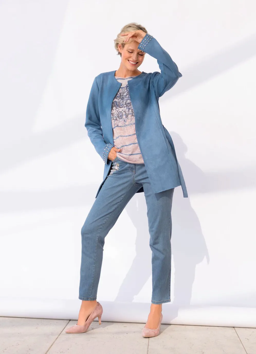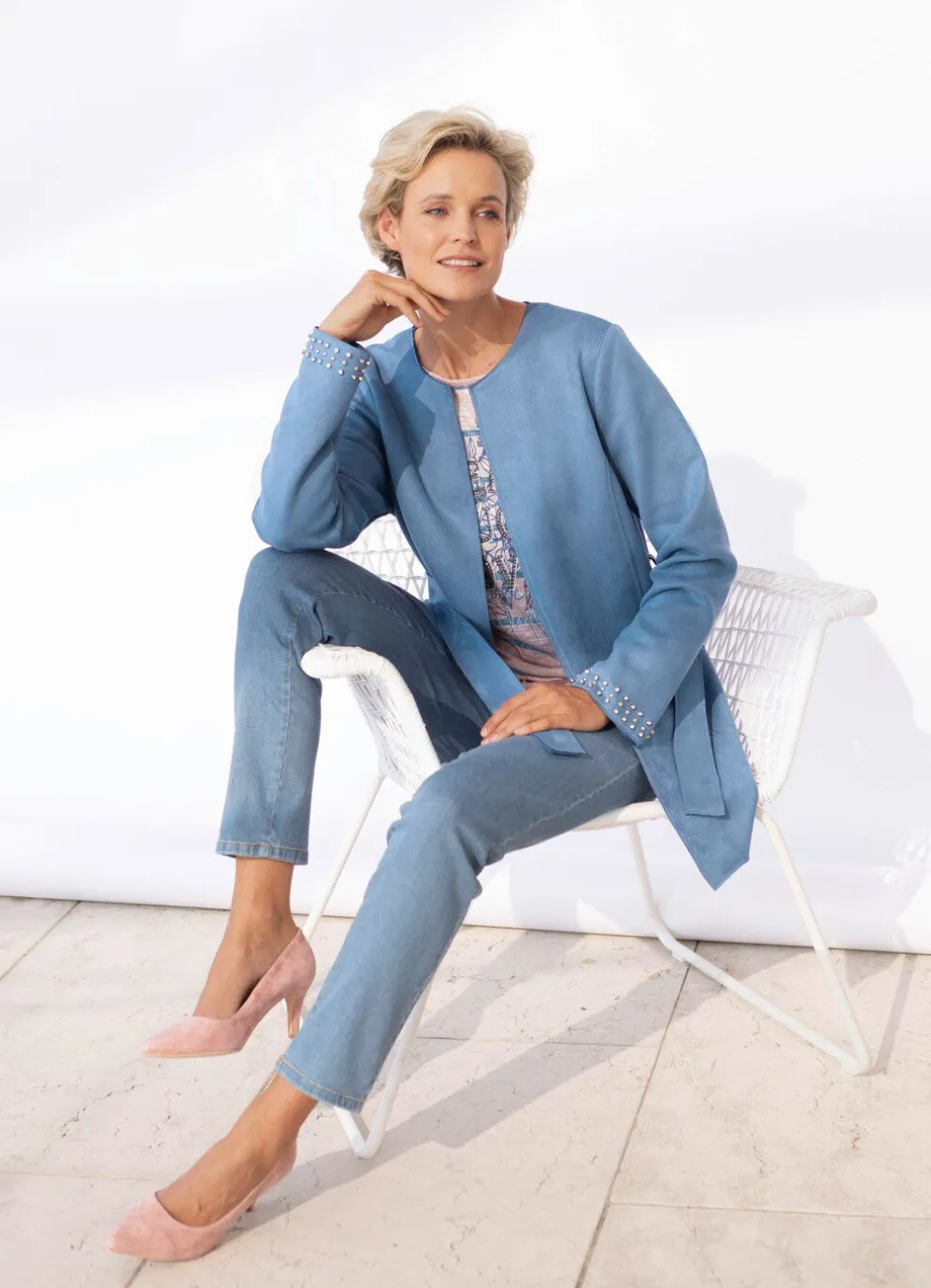 Stilsichere, rauchblaue Jacke mit trendstarker, offener Kantenverarbeitung, rundem Halsausschnitt, Häkchenverschluss, Gürtelschlaufen, Bindegürtel, Nahttaschen sowie Strass- und Nietenzier an den Ärmelabschlüssen. Länge ca. 74 cm, ab Gr. 42 ca. 76 cm, ab Gr. 48 ca. 78 cm.