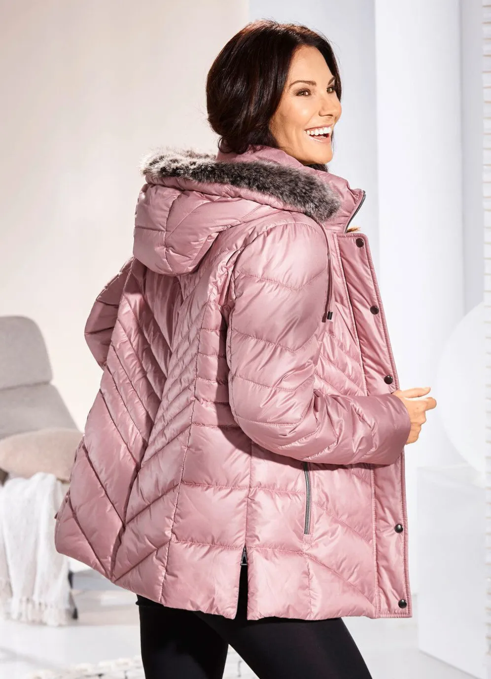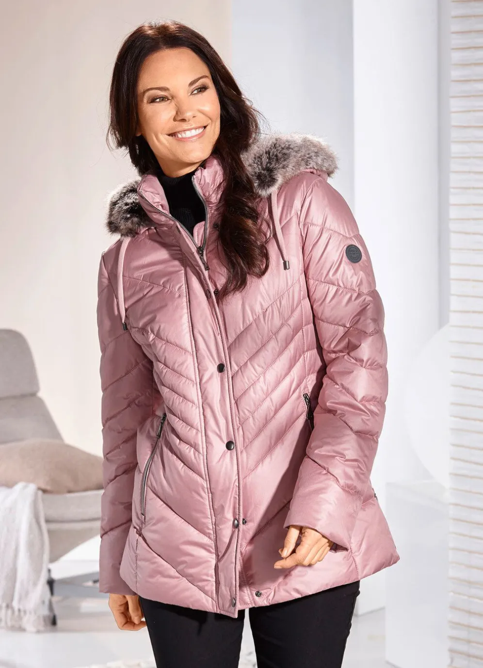Mit sportivem Chic präsentiert sich diese Jacke: abnehmbare Kapuze mit Durchzugsband, Stopper und abnehmbarem Kunstpelz-Besatz, durch Reißverschluss unter der Druckerleiste hoch schließbarer Stehkragen, Reißverschluss an Paspeltaschen und Seitenschlitzen, umschlagbare Ärmel sowie eine Innentasche. Länge ca. 72 cm, ab Gr. 42 ca. 74 cm, ab Gr. 46 ca. 76 cm.