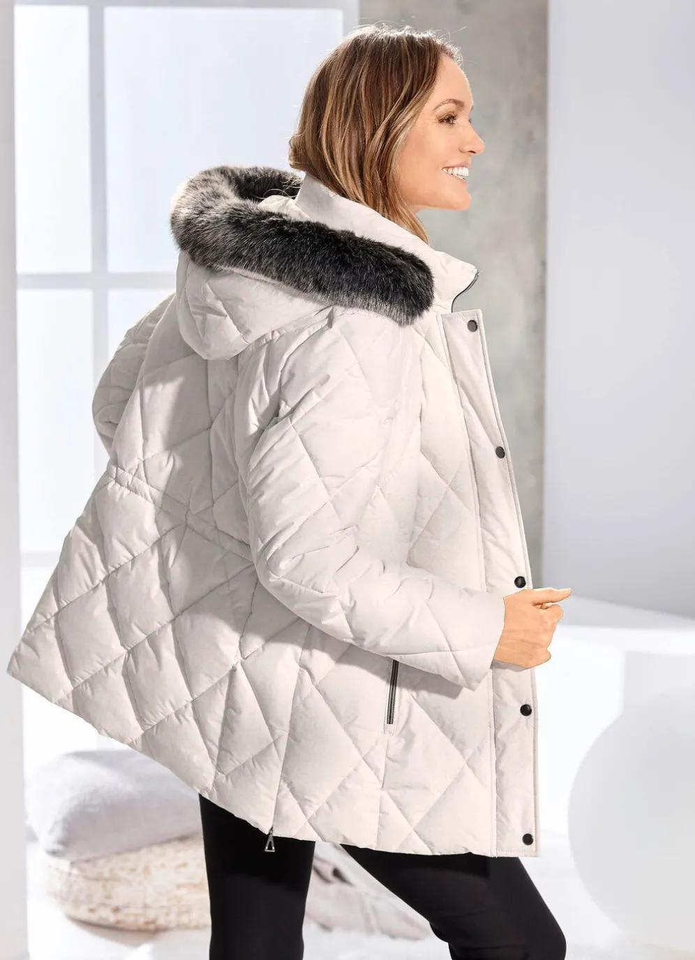 Jacke mit Schneeflocken-Dessin: abnehmbare Kapuze mit Durchzugsband, Stopper und abnehmbarem Kunstpelz-Besatz, durch Reißverschluss unter der Druckerleiste hoch schließbarer Stehkragen, Reißverschluss an den Taschen und Seitenschlitzen, umschlagbare Ärmel sowie eine Innentasche. Länge ca. 78 cm, ab Gr. 46 ca. 80 cm, ab Gr. 52 ca. 82 cm.