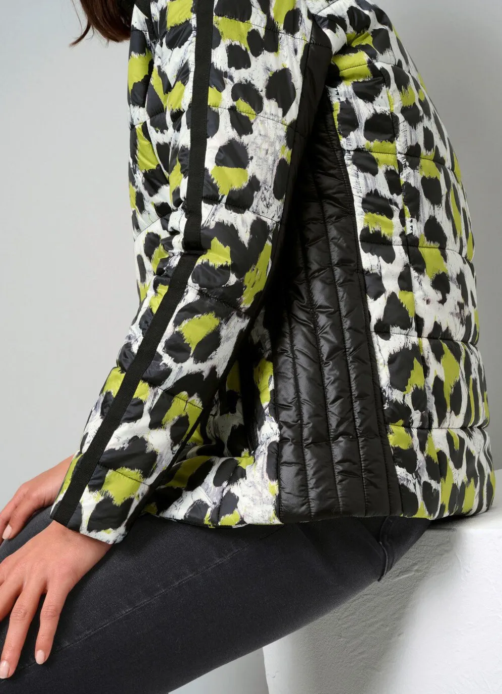 Jacke mit trendgenauem Animal Print, durch Reißverschluss hoch schließbarem Stehkragen, Paspeltaschen mit Reißverschluss, figurschmeichelnder Längssteppung seitlich, umschlagbaren Ärmeln sowie einer Innentasche. Länge ca. 63 cm