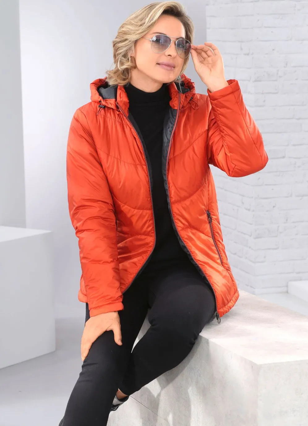 Pfiffige Jacke mit Durchzugsband und Stopper an der abnehmbaren Kapuze, durch Reißverschluss hoch schließbarem Stehkragen, Taschen mit Reißverschluss sowie einer Innentasche. Länge ca. 68 cm, ab Gr. 38 ca. 70 cm, ab Gr. 44 ca. 72 cm, ab Gr. 48 ca. 74 cm, bei Gr. 52 ca. 76 cm.