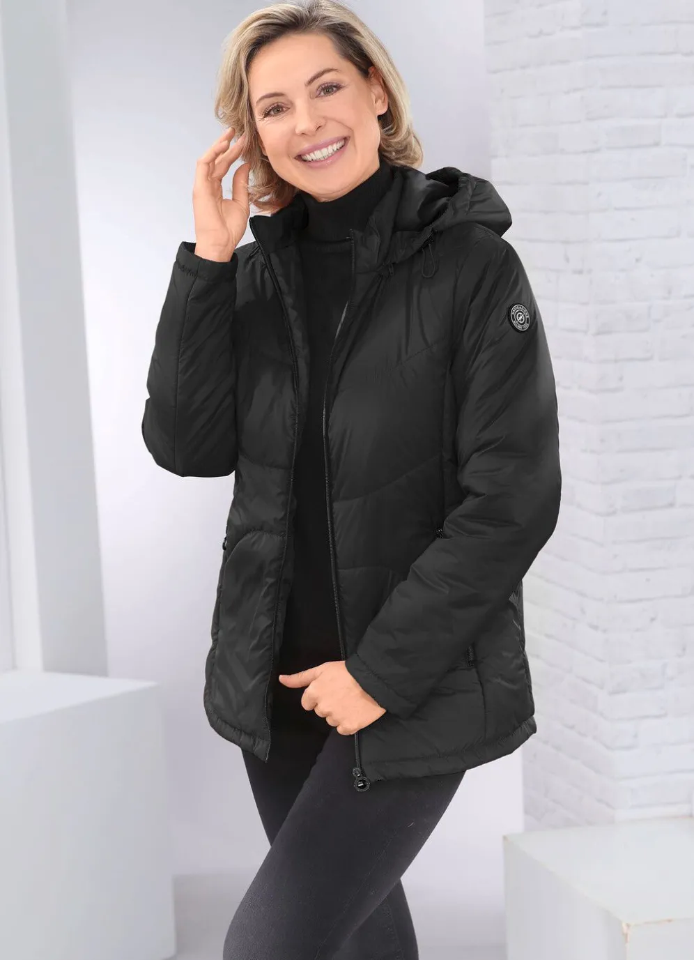 Pfiffige Jacke mit Durchzugsband und Stopper an der abnehmbaren Kapuze, durch Reißverschluss hoch schließbarem Stehkragen, Taschen mit Reißverschluss sowie einer Innentasche. Länge ca. 68 cm, ab Gr. 38 ca. 70 cm, ab Gr. 44 ca. 72 cm, ab Gr. 48 ca. 74 cm, bei Gr. 52 ca. 76 cm.