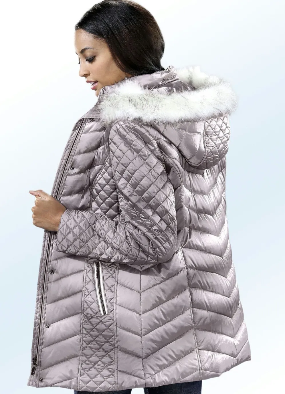 Diese schöne Jacke mit Steppvariationen wird Ihre Garderobe bereichern: abnehmbare Kapuze mit Durchzugsband, Stopper sowie abnehmbarem Kunstpelz-Besatz, durch Reißverschluss unter der Druckerleiste hoch schließbarer, gefältelter Stehkragen, weiße Kontrastpaspelierung an den Reißverschlusstaschen und entlang der Verschlussleiste, Windfangärmel mit elastischen Bündchen sowie eine Innentasche. Länge ca. 80 cm, bei K-Gr. ca. 75 cm.