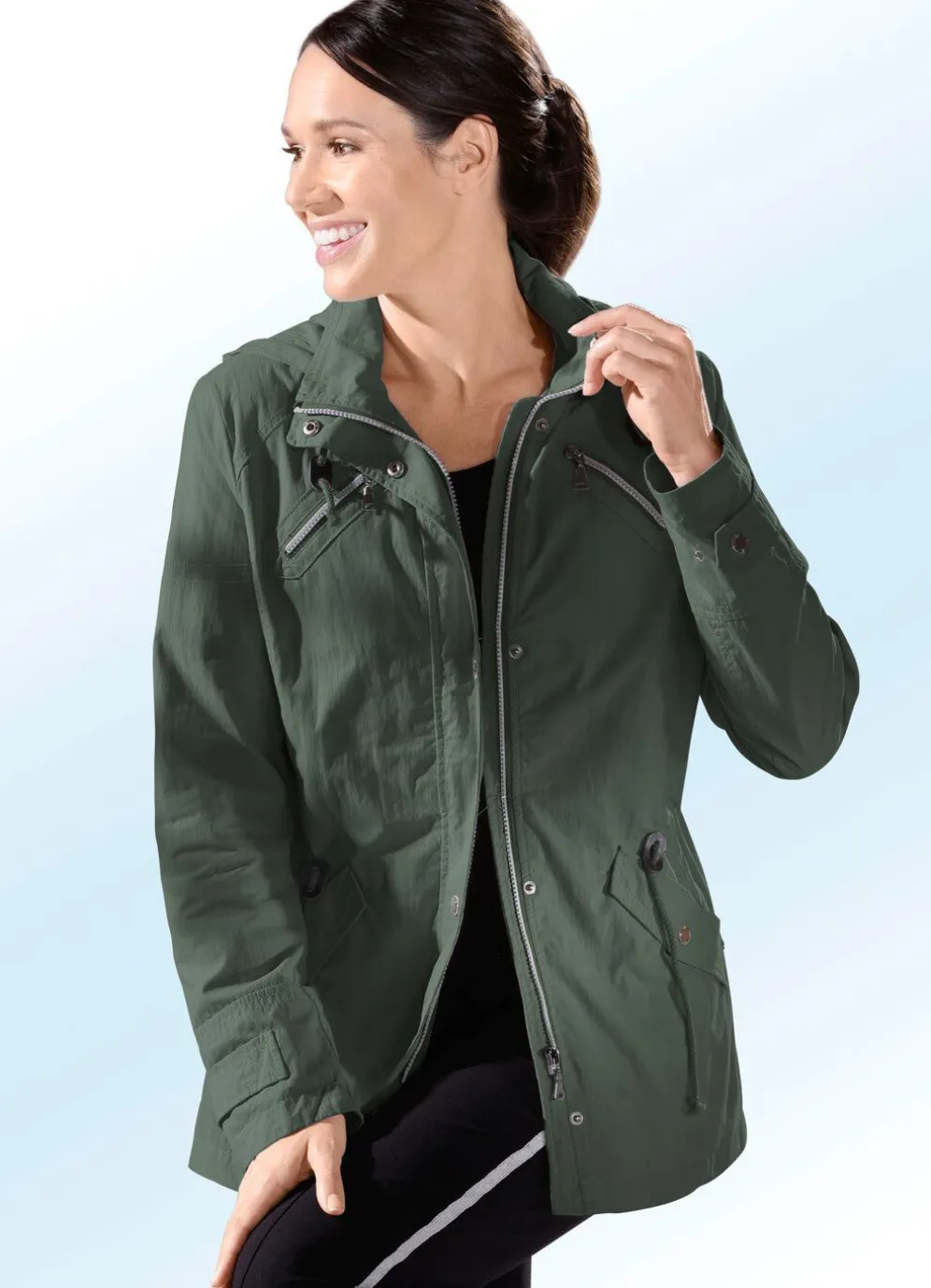 Aufwendig gestylte Jacke: Kordelzug mit Stopper in der Taille und in der Kapuze, durch Reißverschluss unter der Druckerleiste hoch schließbarer Steh-Umlegekragen, Reißverschluss-Brusttaschen, Schubtaschen mit Patte und Zierdrucker, Ärmelriegel mit Drucker zur Regulierung der Weite sowie eine Innentasche. Länge ca. 72 cm, ab Gr. 42 ca. 75 cm, ab Gr. 48 ca. 78 cm.