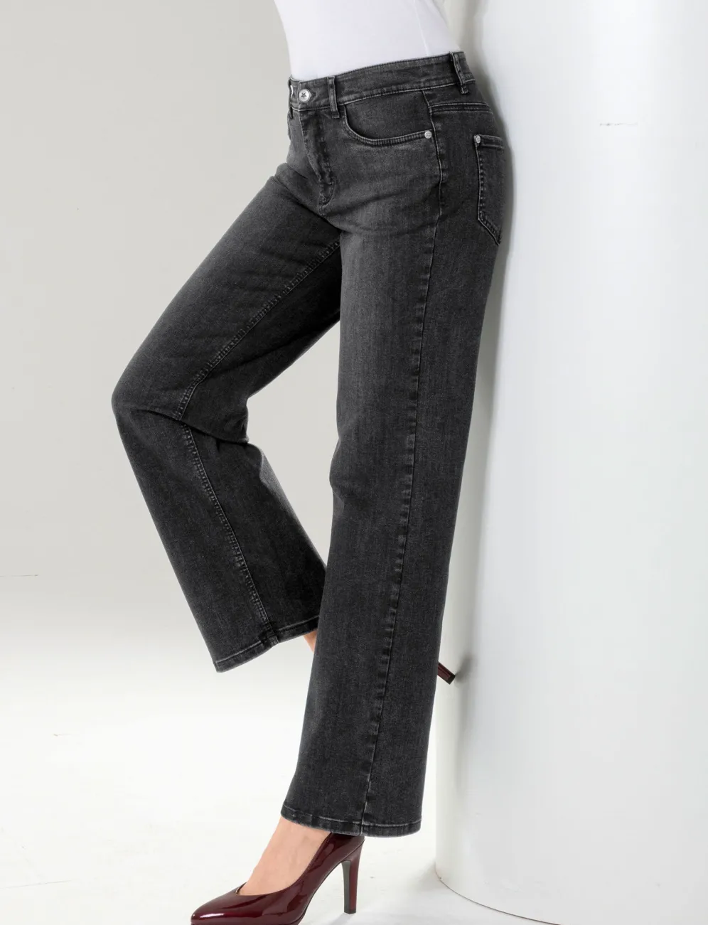 Stars by ascari – Modischer Denim-Look mit Stern-Details. Zeitlose Jeans mit weiterem Beinverlauf in 5-Pocket-Form mit dekorativen Ziernieten, Knopf- und Reißverschluss, Gürtelschlaufen, Jeanssattel, Sternniete auf der Kleingeldtasche sowie Knopf mit Sternprägung. Innenbeinlänge ca. 78 cm, Beinweite ca. 44 cm.