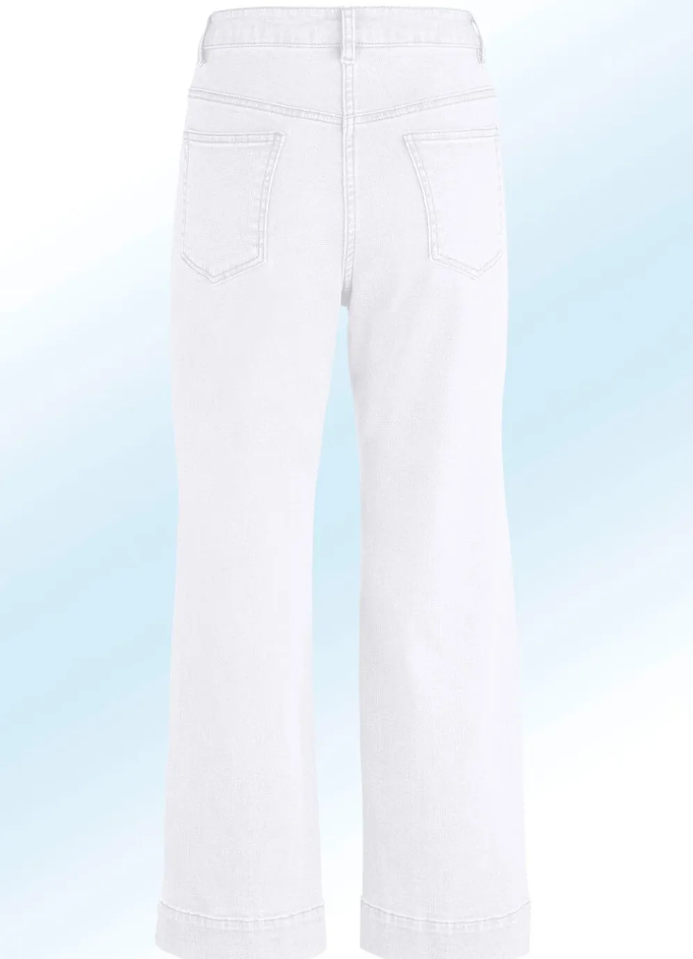 Die Qualität: softer Stretch-Denim, „enzym stone washed“, querelastisch, aus 80% Baumwolle, 10% Viskose, 7% Polyester und 3% Elasthan; in Weiß aus softem Feingabardine, aus 97% Baumwolle und 3% Elasthan