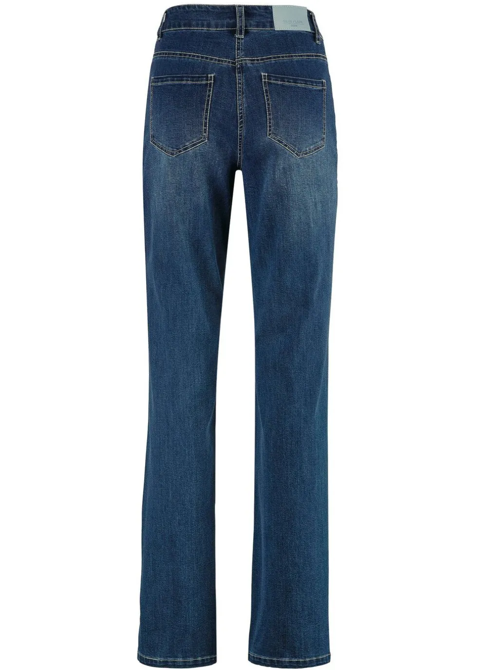 Topaktuelle 4-Pocket-Jeans mit modischer Beinweite: elastischer Formbund, Gürtelschlaufen, Knopf- und Reißverschluss, aufgesetzte Seitentaschen, dezente Used-Effekte vorne und hinten sowie Jeanssattel. Innenbeinlänge ca. 78 cm, Fußweite ab 48 cm.
