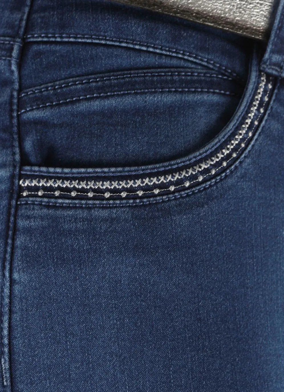 Attraktive, hochelastische 5-Pocket-Jeans: elastischer Formbund, Gürtelschlaufen, Knopf- und Reißverschluss, kontrastfarbene Stickerei an den Seitentaschen sowie Jeanssattel. Innenbeinlänge ca. 78 cm, Fußweite ab 32 cm.