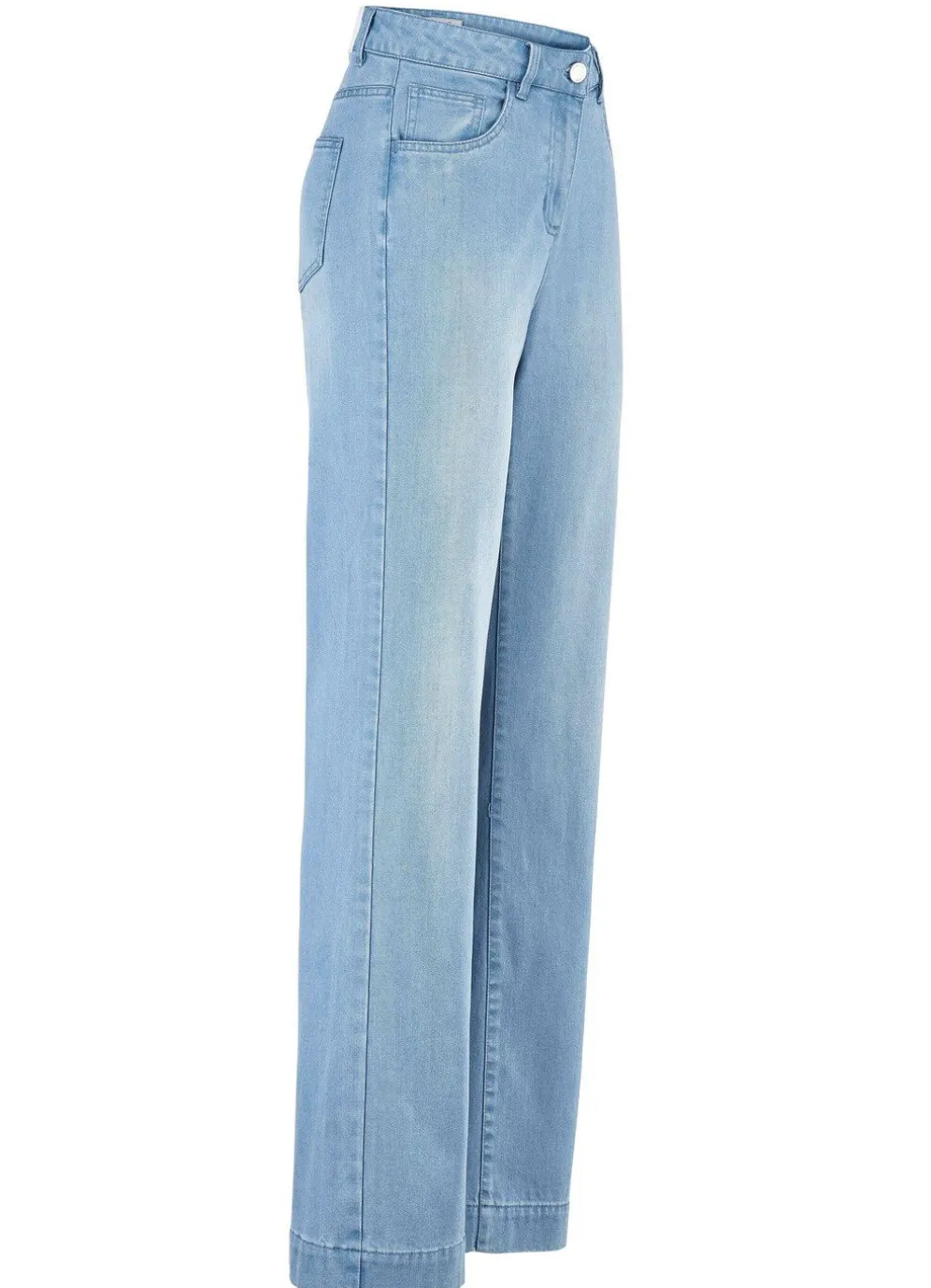 Fabelhafte Jeans in 5-Pocket-Form mit luftig-weitem Bein: elastischer Formbund, Gürtelschlaufen, Knopf- und Reißverschluss, Jeanssattel sowie breiter, abgesteppter Saumabschluss. Innenbeinlänge ca. 78 cm, Fußweite ab 48 cm.