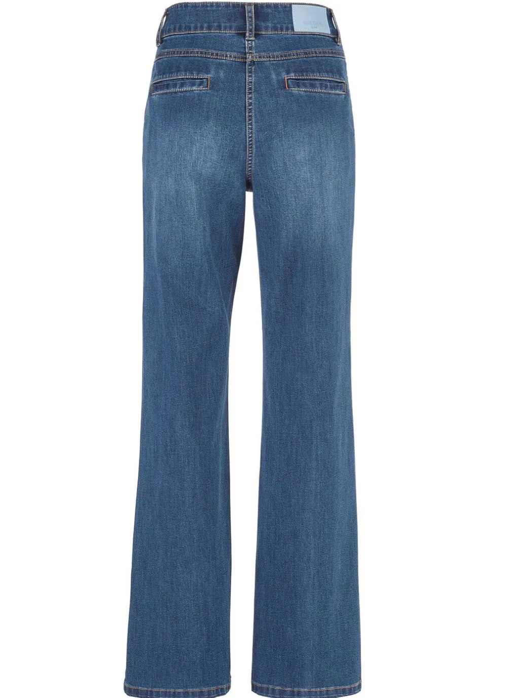 Perfekt geschnittene Jeans mit Bundfalten und weitem Beinverlauf sowie aktueller Waschung: elastischer Formbund, Gürtelschlaufen, Knopf- und Reißverschluss, Seitentaschen sowie Jeanssattel. Innenbeinlänge ca. 78 cm, Fußweite ab 48 cm.