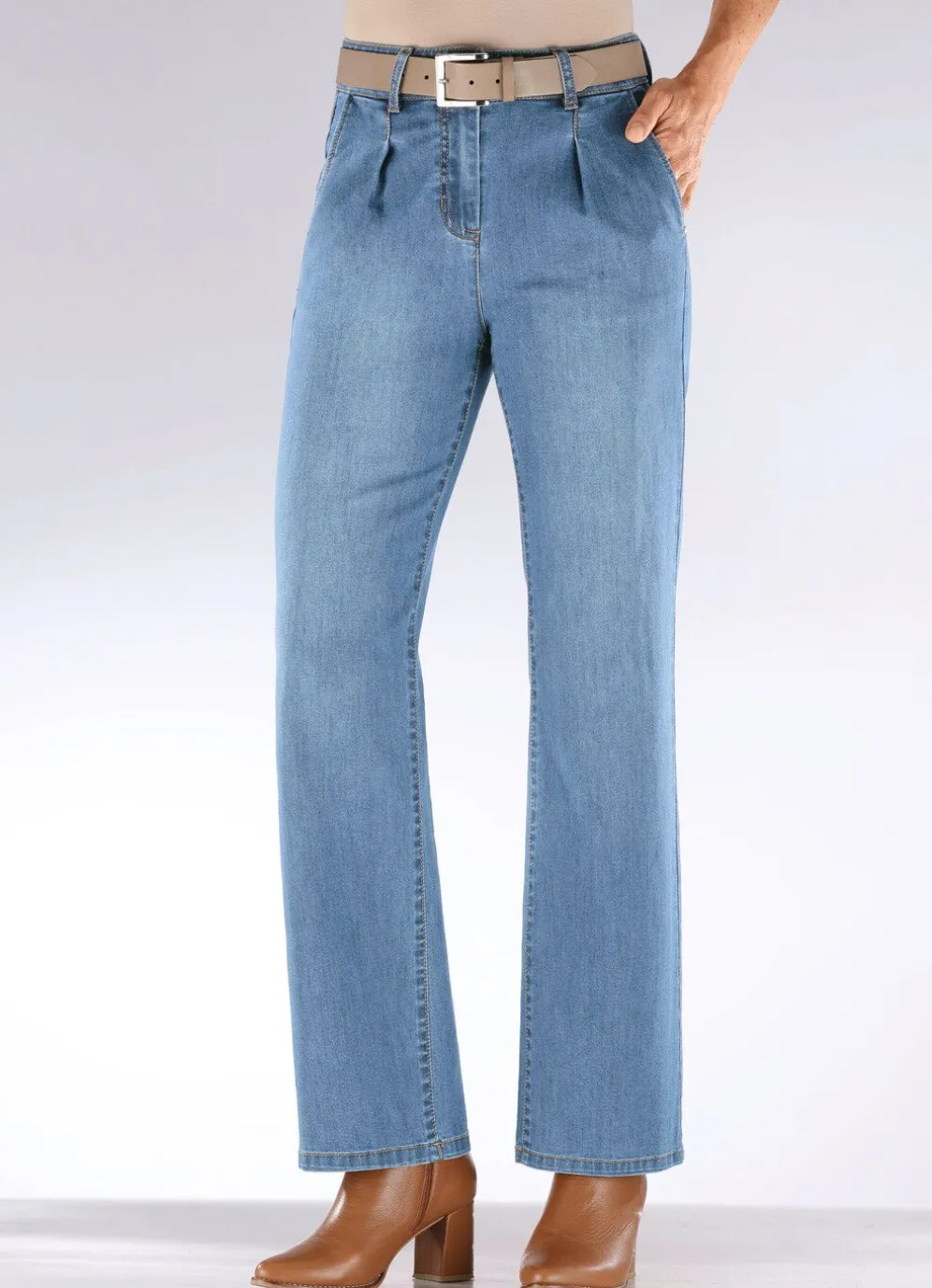 Perfekt geschnittene Jeans mit Bundfalten und weitem Beinverlauf sowie aktueller Waschung: elastischer Formbund, Gürtelschlaufen, Knopf- und Reißverschluss, Seitentaschen sowie Jeanssattel. Innenbeinlänge ca. 78 cm, Fußweite ab 48 cm.