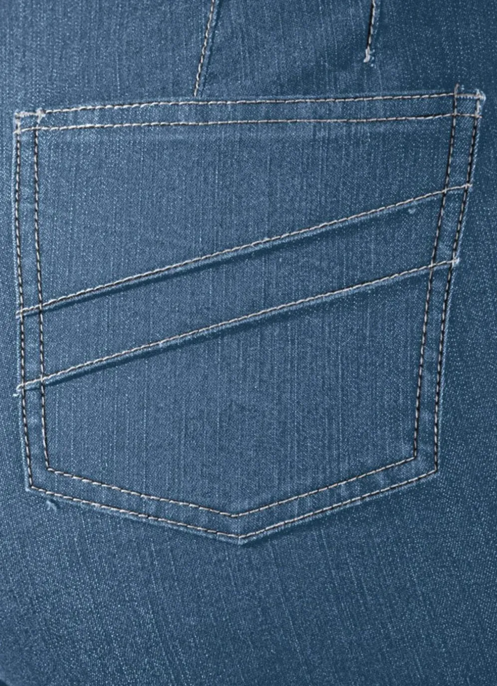 Hochelastische, tragangenehme Jeans: angeschnittener Bund, Gummibundeinlage mit bis zu 6 cm Dehnreserve, Knopf- und Reißverschluss, figurformende Abnäher unterhalb des Bundes rundum, figurgünstige Teilungsnähte vorne. Innenbeinlänge ca. 80 cm, Fußweite ab 42 cm.
