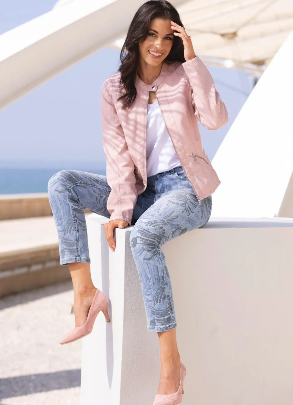 Raffinierte Jeans in Jeansblau und 7/8-Länge in 5-Pocket-Form mit floralem allover Druck in Blau-Anthrazit: dezenter Used-Effekt auf Vorder und Hinterhose, elastischer Formbund, Knopf- und Reißverschluss sowie Jeanssattel. Innenbeinlänge ca. 67 cm.