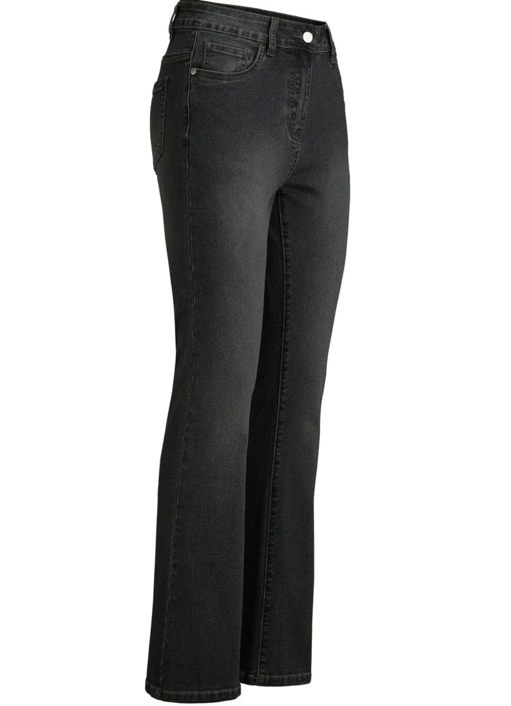 Angesagte Jeans mit leicht ausgestellter Beinweite für einen lässigen Style: 5-Pocket-Form, elastischer Formbund, Knopf- und Reißverschluss, Ziernieten an den vorderen Taschen, Jeanssattel sowie dezente Auswascheffekte allover. Die Waschungen garantieren eine tolle Optik! Ohne Gürtel. Innenbeinlänge ca. 77 cm, Fußweite ab 44 cm.