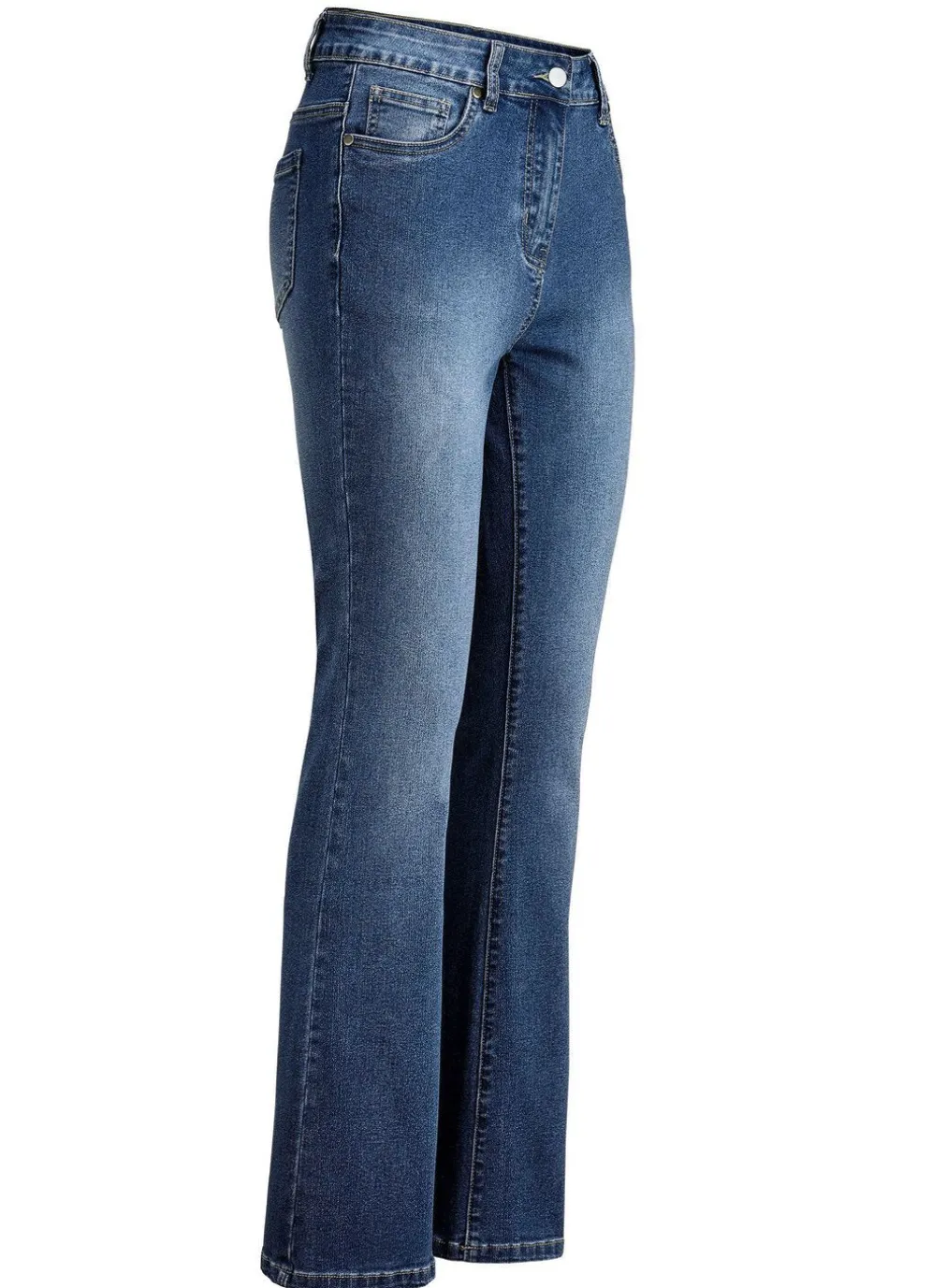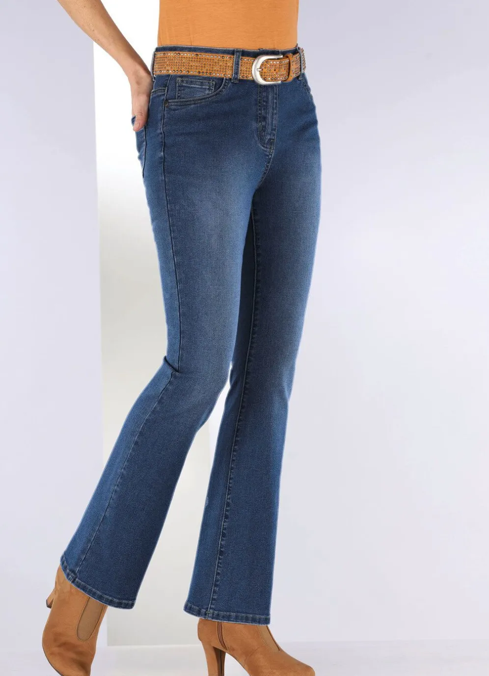 Angesagte Jeans mit leicht ausgestellter Beinweite für einen lässigen Style: 5-Pocket-Form, elastischer Formbund, Knopf- und Reißverschluss, Ziernieten an den vorderen Taschen, Jeanssattel sowie dezente Auswascheffekte allover. Die Waschungen garantieren eine tolle Optik! Ohne Gürtel. Innenbeinlänge ca. 77 cm, Fußweite ab 44 cm.