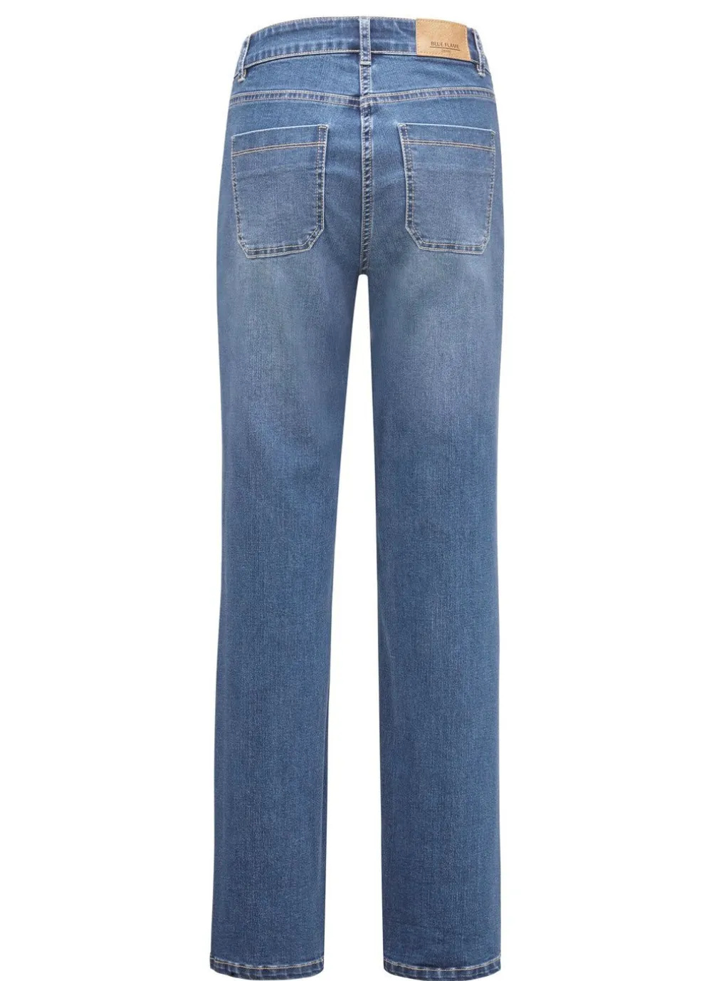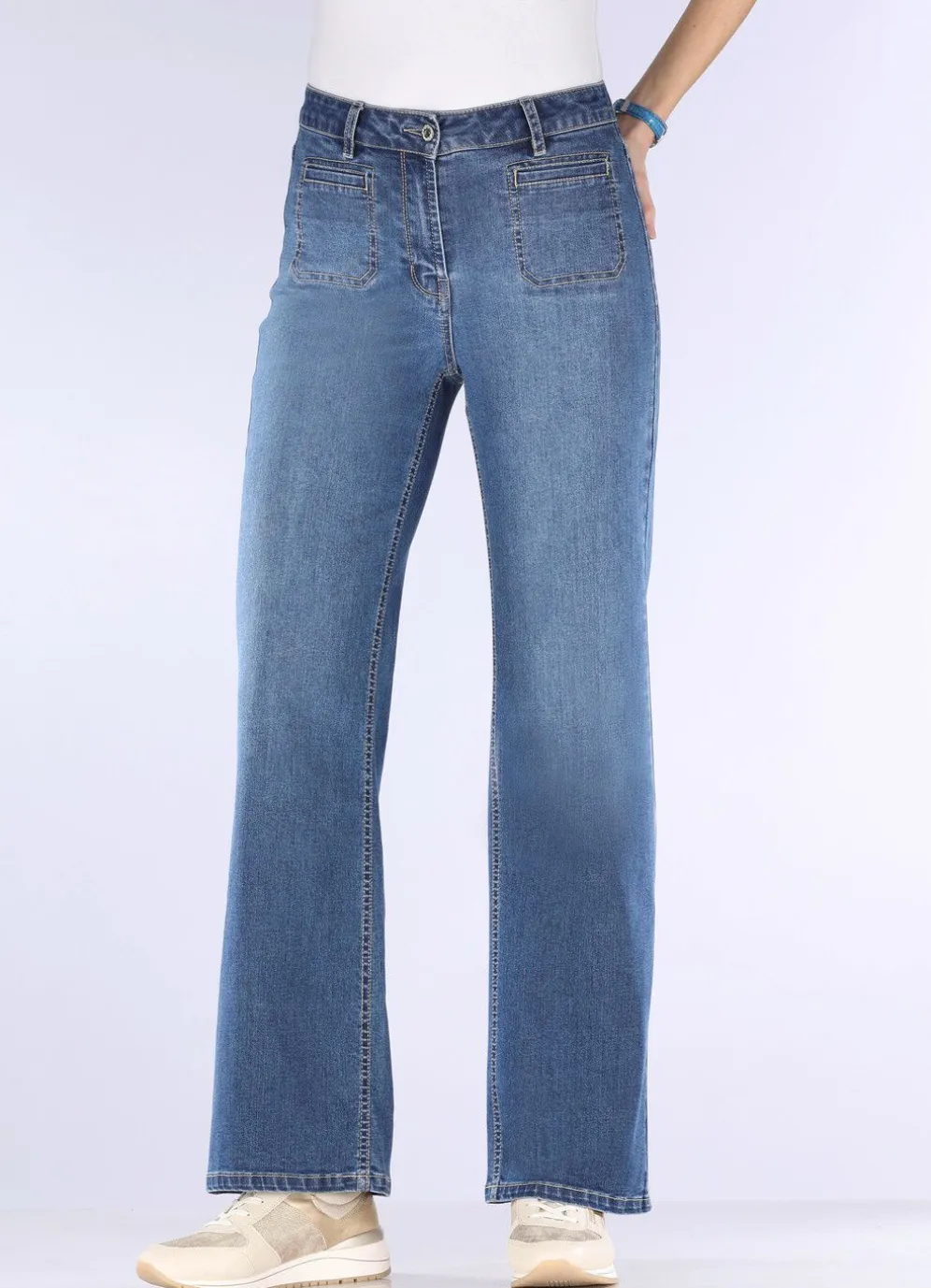 Angesagte Jeans mit weitem Beinverlauf sowie aktueller Waschung: elastischer Formbund, Gürtelschlaufen, Knopf- und Reißverschluss, modische, aufgesetzte Vordertaschen, Gesäßtaschen sowie Jeanssattel. Innenbeinlänge ca. 77 cm, Fußweite ab 49 cm.