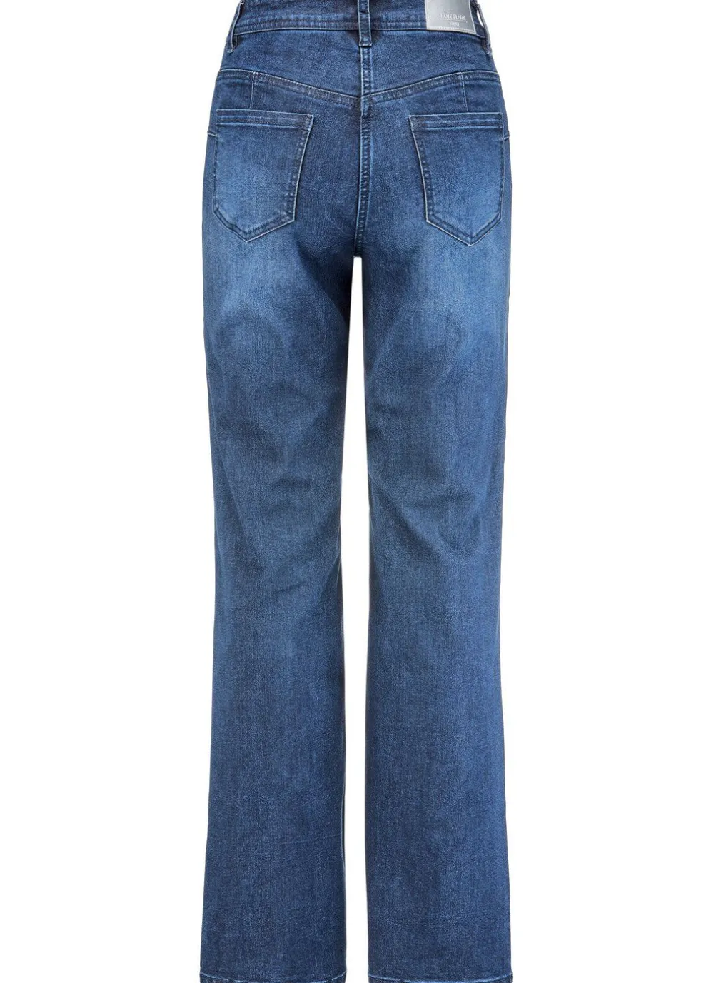 Komfortable 5-Pocket-Jeans mit modischer Beinweite und Push-up-Effekt: elastischer Formbund, Gürtelschlaufen, Knopf- und Reißverschluss, dezente Used-Effekte vorne und hinten, aufgesetzte Gesäßtaschen sowie Jeanssattel. Innenbeinlänge ca. 78 cm, Fußweite ab 48 cm.