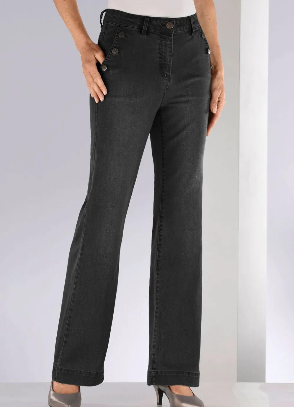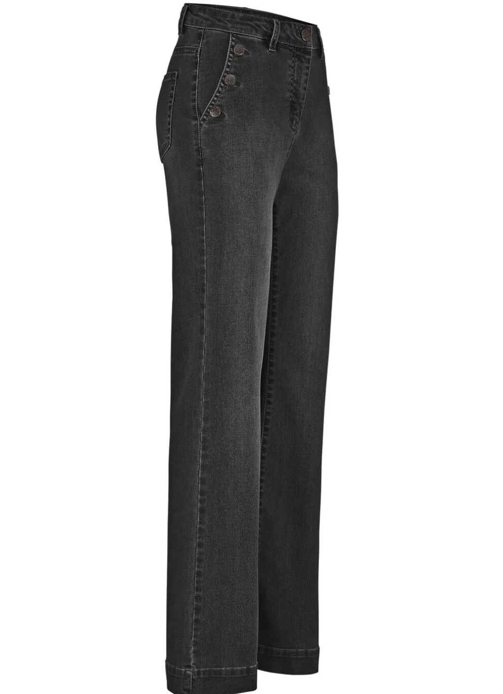 Fabelhafte Jeans in modischer Weite: elastischer Formbund, Knopf- und Reißverschluss, Seitentaschen mit Zierknöpfen, aufgesetzte Gesäßtaschen, Jeanssattel sowie breiter, abgesteppter Saumabschluss. Innenbeinlänge ca. 78 cm, Fußweite ab 48 cm.